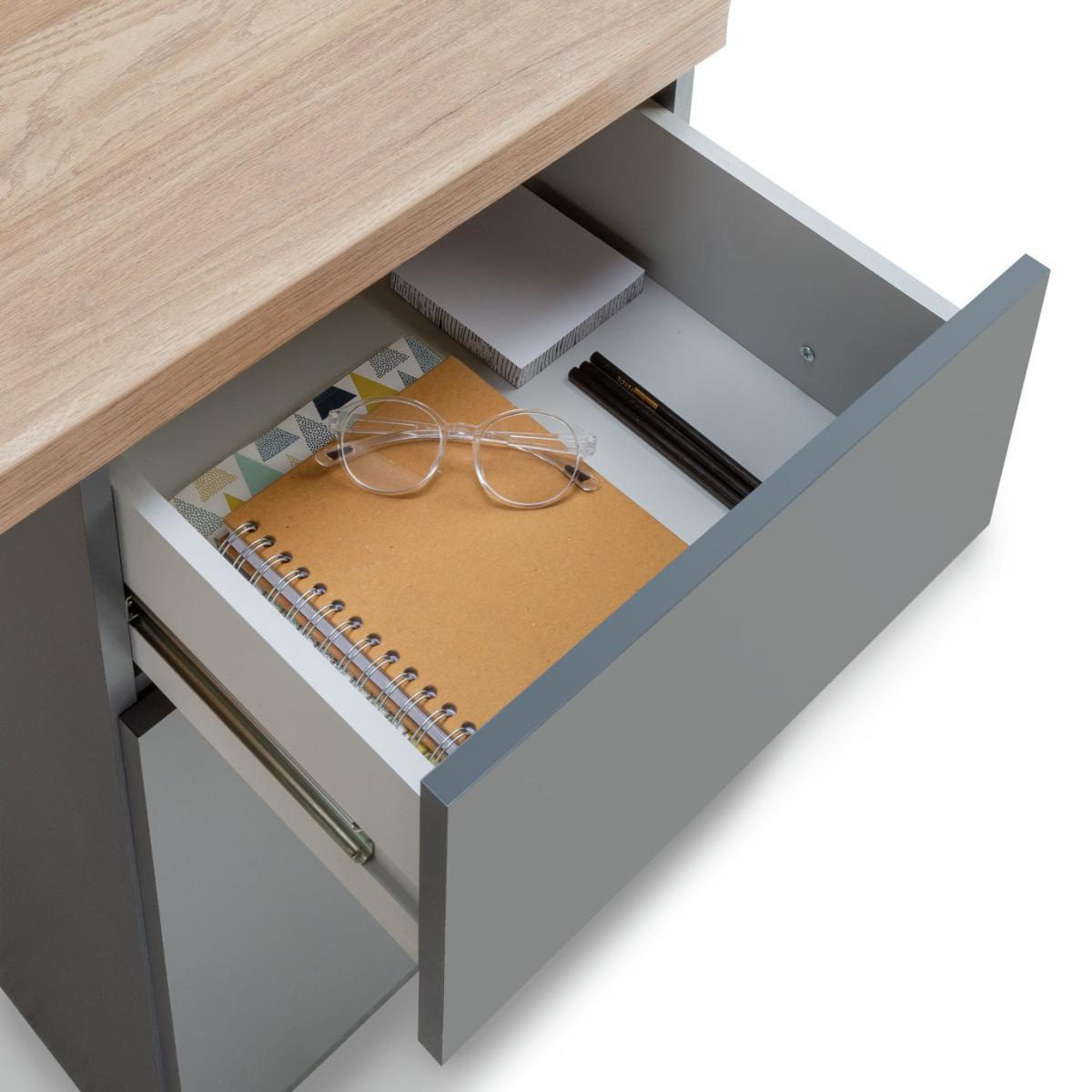 I really like this desk for its modern, two-tone aesthetic that blends natural wood warmth with a sleek, contemporary finish. It works well in both home office setups and creative workspaces, especially when paired with minimalist or Scandinavian interiors. To style it effectively, I’d suggest keeping accessories minimal-perhaps a simple desk lamp and a few organisational trays-to emphasise its clean lines. It can also be complemented by vintage or industrial accessories for contrast, or softened with a textured chair and a plant for a more inviting look. Its compact size makes it versatile for smaller rooms, while the colours keep it feeling fresh and adaptable to various colour schemes.
