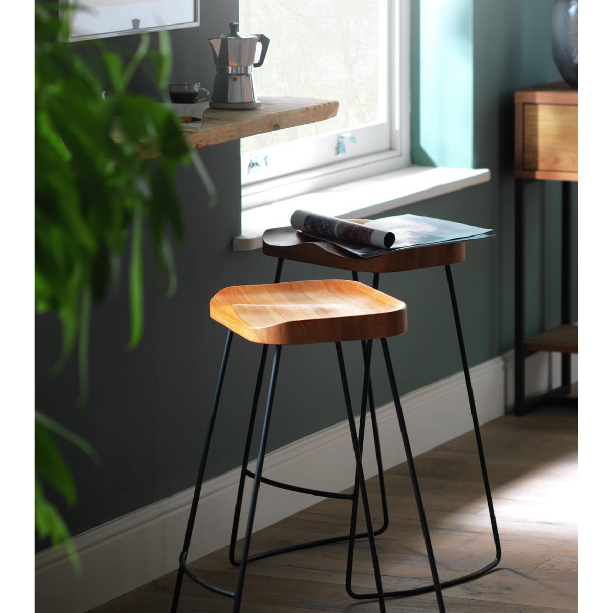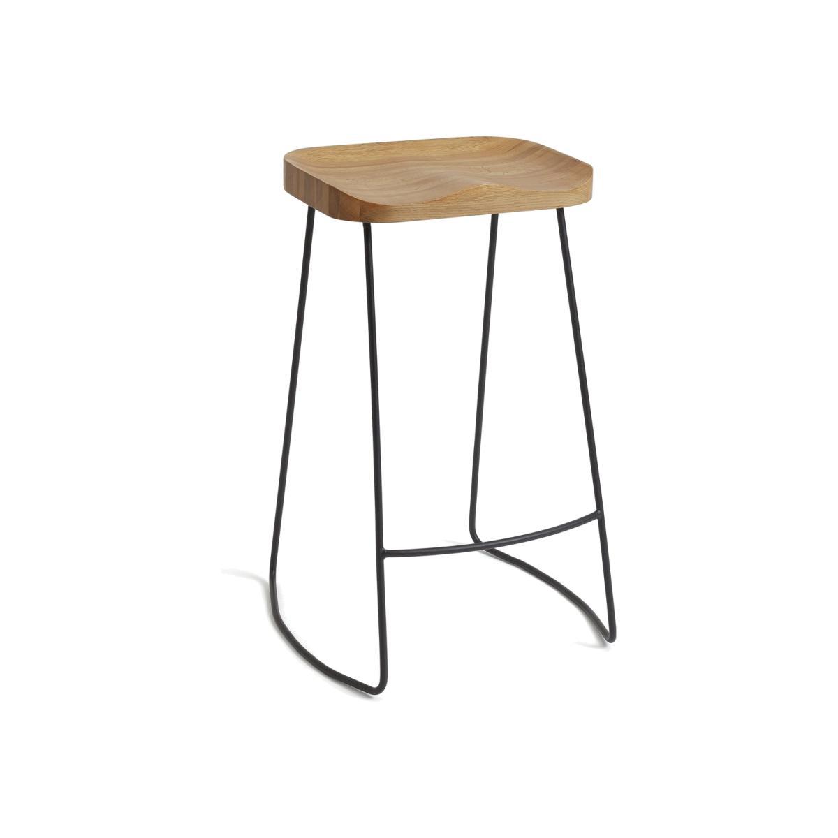 Pull up our bar stool and pull out the style. Do we love this bar stool? You bet. It's understated and undeniably hip. And it's beautifully versatile. Sits well against a breakfast bar. Sets the scene for an intimate dinner a deux. Or an additional seat for extra guests. Whatever the scenario, it's a must have. Settle into the solid oak wood seat. Smooth and subtly carved for comfort. Strong slim metal legs add to the designer look. Why settle for one? Two's company. Three's a party. As Sinatra said, set 'em up Jo.