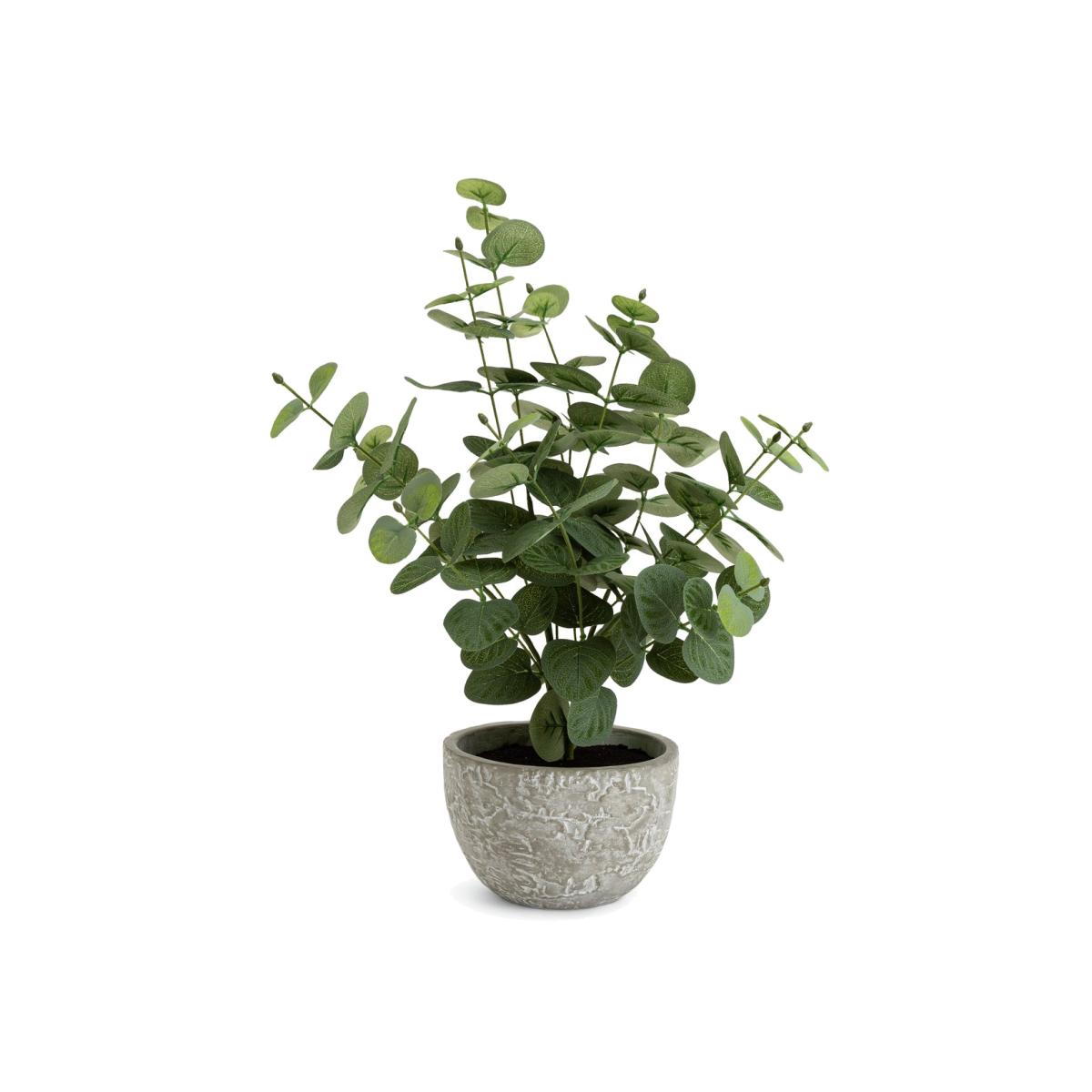Pretty, potted and impressive. Encased within a grey rustic cement pot, this lifelike eucalyptus plant stands tall and proud. Each realistic leaf looking forever lush. An effortless way to add a splash of year-round greenery. Size H42, W25.5, D25.5cm.