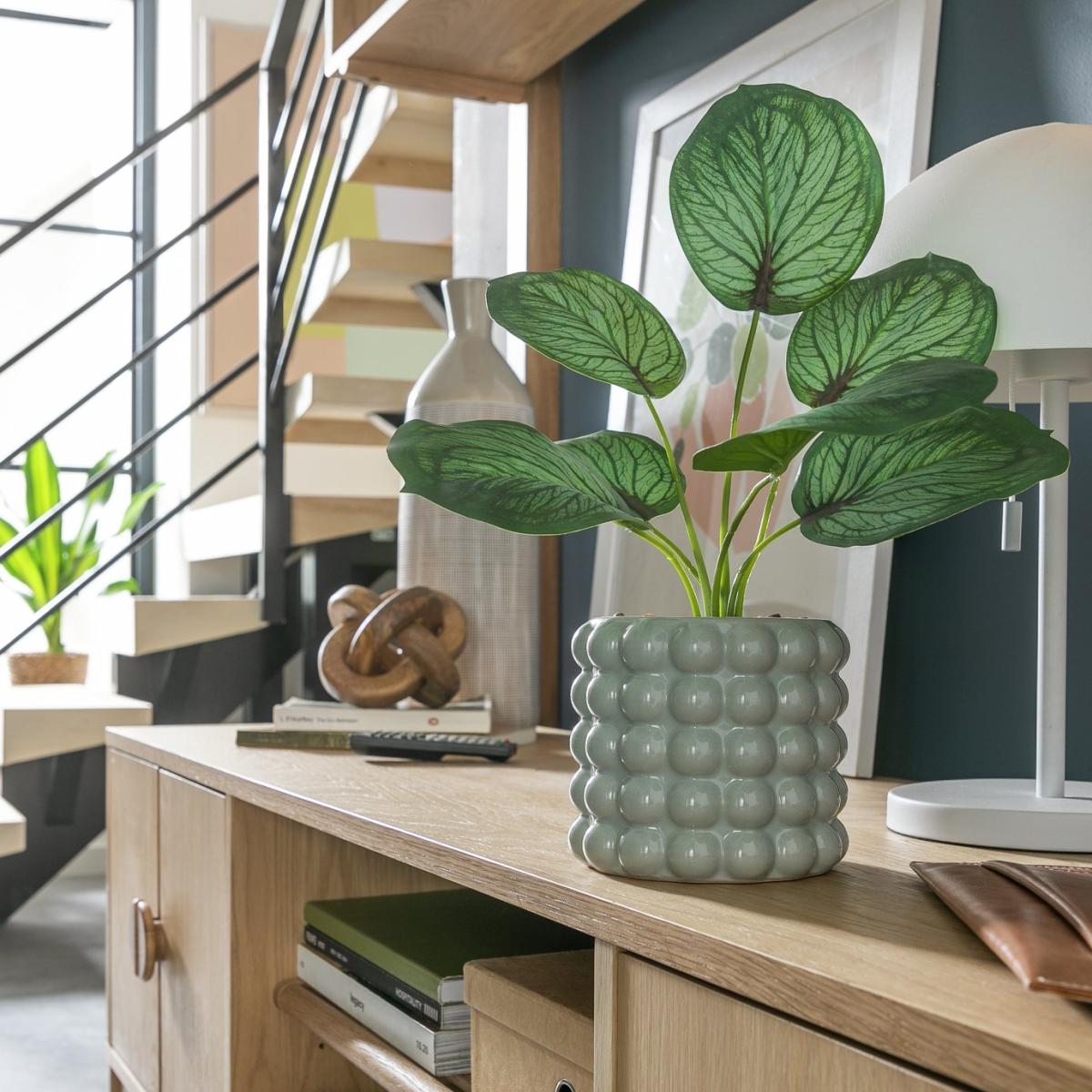 The faux Calathea adds a fresh, natural touch without the maintenance of real plants, making it ideal for those seeking greenery with minimal effort. Its sculptural form works well in both modern and eclectic interiors, especially when paired with neutral tones or textured surfaces. I love placing it on side tables, shelves, or window sills to create visual interest and balance. When styling, consider pairing it with other ceramic or textured decorative objects for a curated look, and ensure it’s placed in well-lit areas to highlight its striking leaf pattern. This piece is versatile and can brighten up kitchens, offices, or living spaces, bringing a subtle touch of nature indoors.