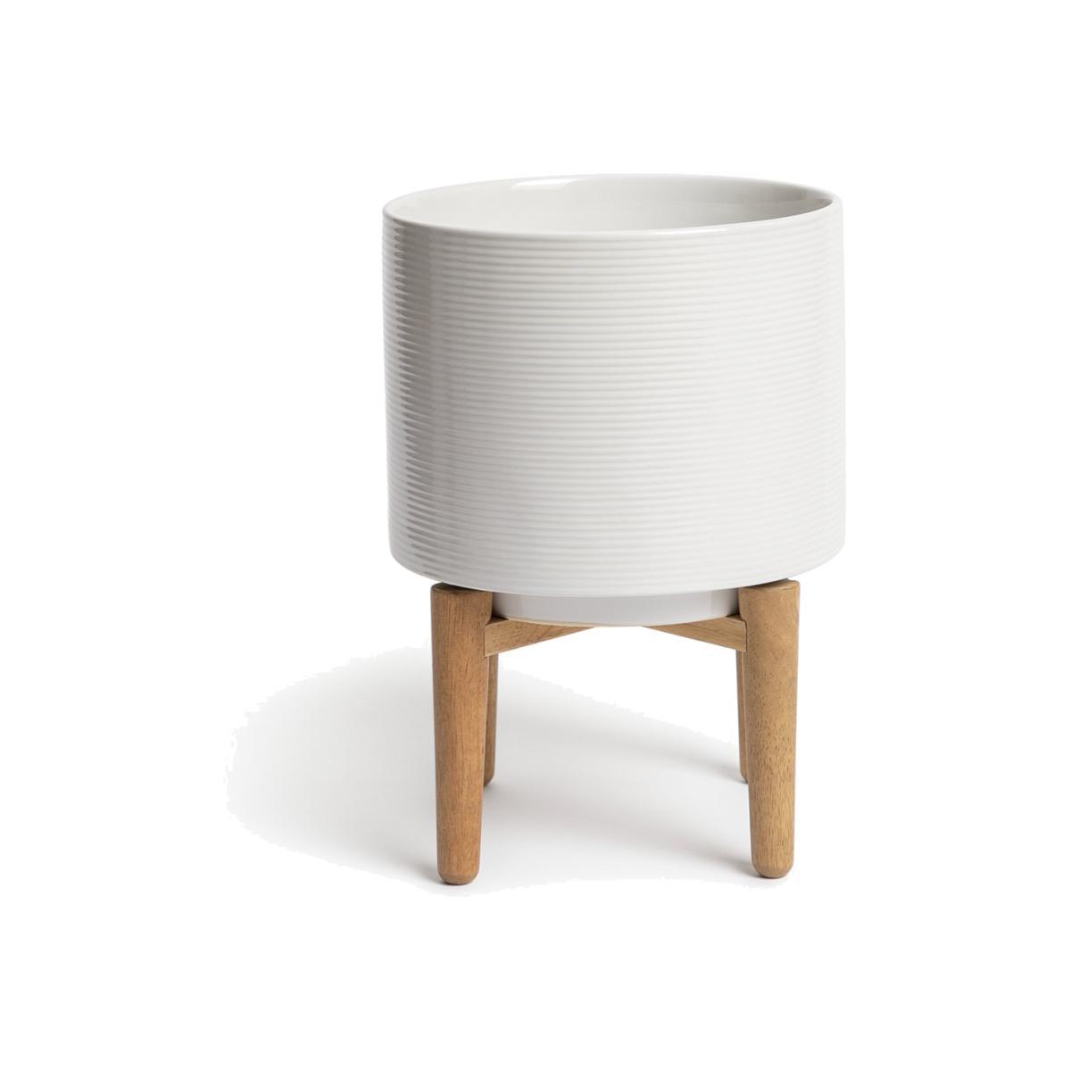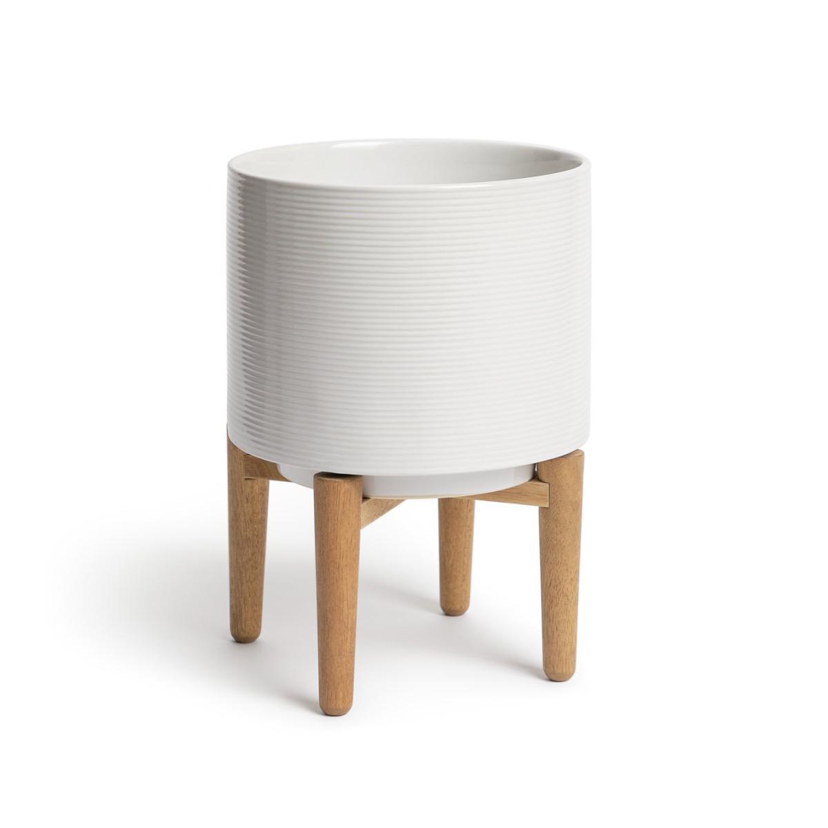 A perfect perch for prized plants. Show off your best greenery with this large planter. Featuring a textured ceramic finish and elegant wooden legs, the circular plant pot gives a lesson in minimalist scandi design with a sophisticated edge. With a height of 30.5cm and a width of 22.5cm, it can house a range of plants, from palms and peace lilies to figs, ferns and more. Leafy laidback luxury.