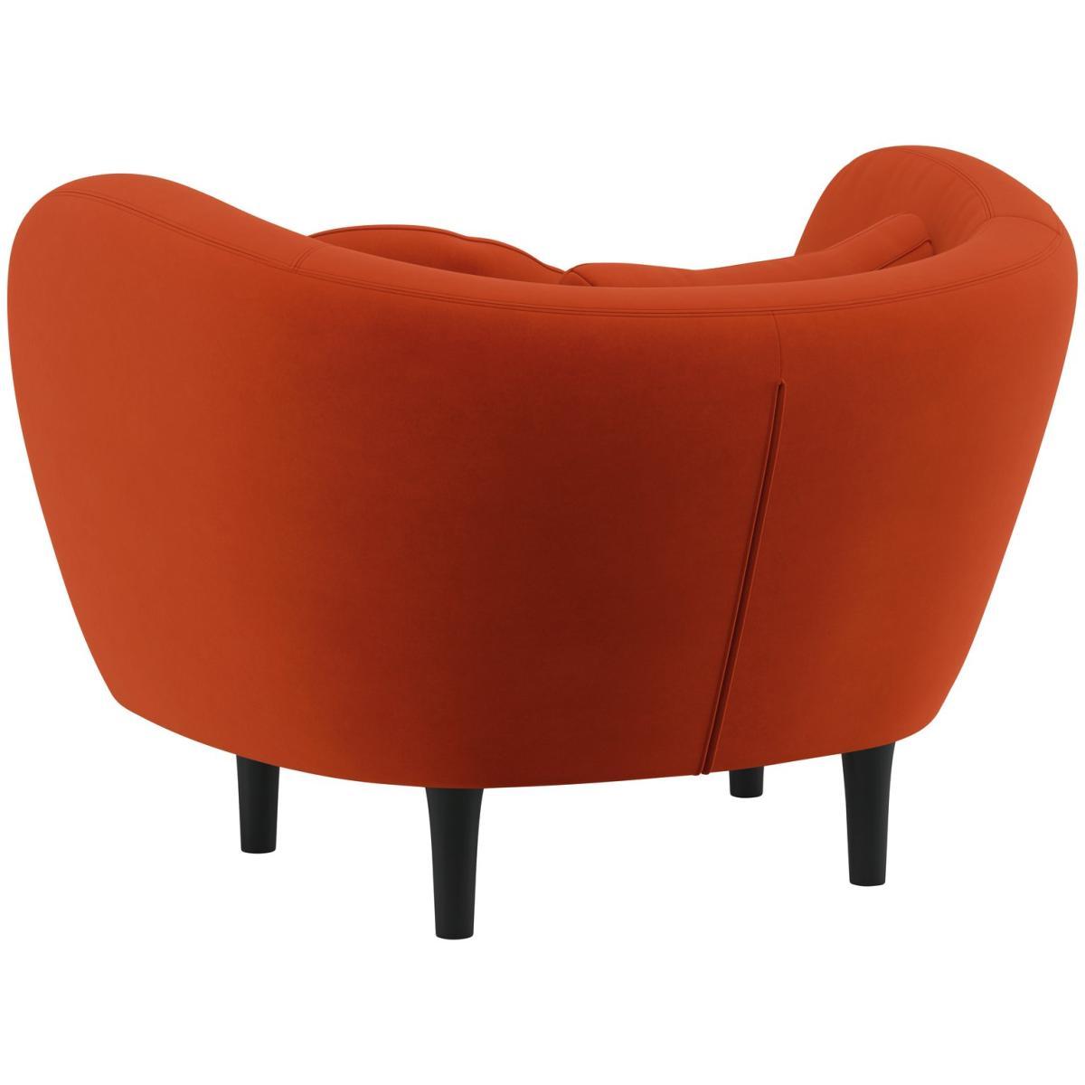 I love this armchair for its bold colour and plush velvet finish, which instantly adds a pop of personality to any space. The strong orange hue works especially well in modern or eclectic interiors, providing a warm focal point without overwhelming the room. It pairs nicely with neutral tones or contrasting colours like teal or deep charcoal for visual interest. Practical styling tips include using it to accentuate a cosy reading corner or as an eye-catching piece in a living room setting. Because of its vibrant colour and soft texture, it's best styled with more subdued accessories and minimalist surrounding furniture to let it really stand out. The chair’s compact size also makes it versatile for smaller spaces or as an additional seating option in larger interiors.