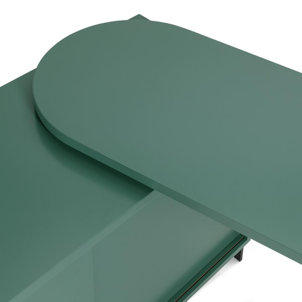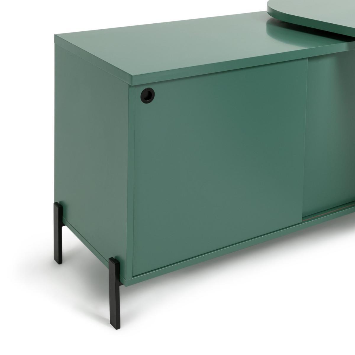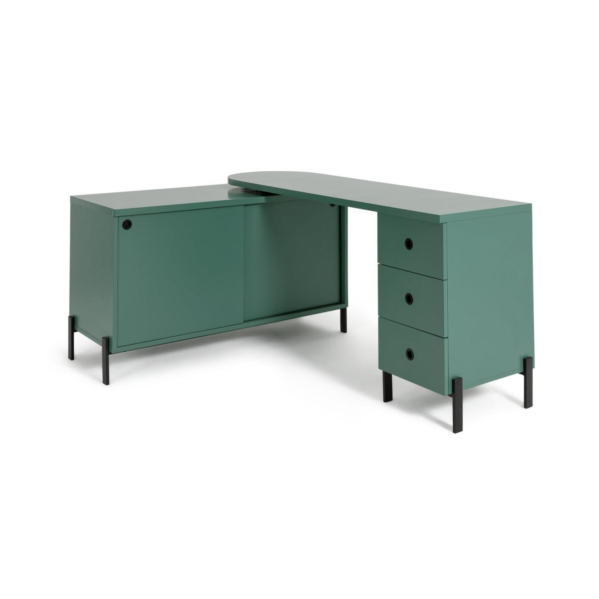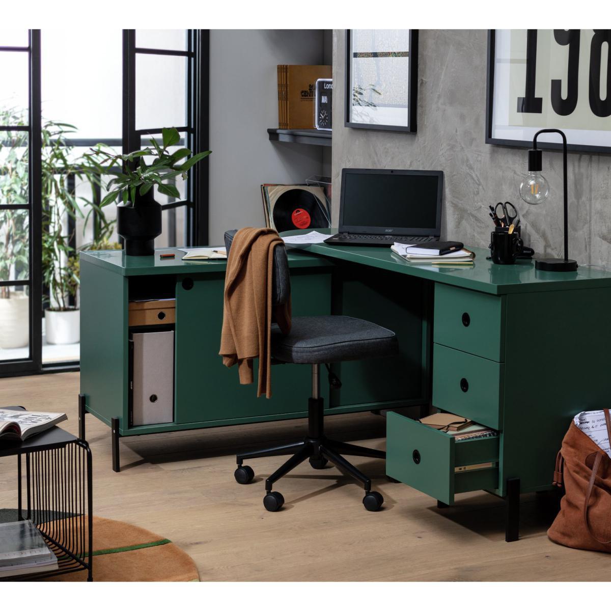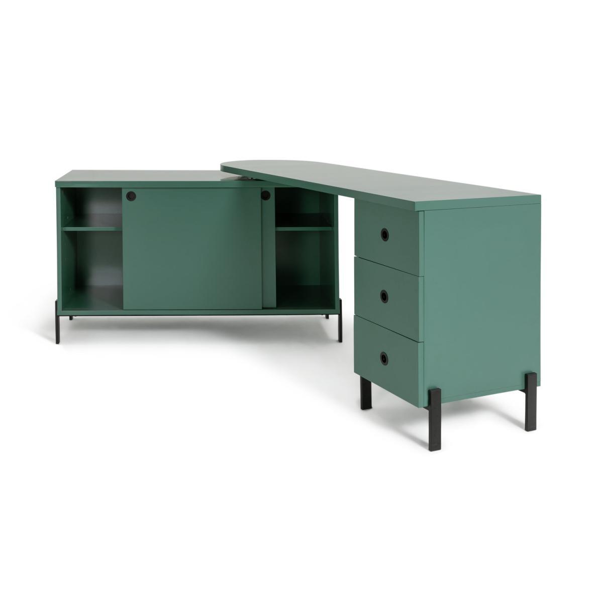 Kit out your home office with our versatile steel swivel desk. The clean lines and green finish give your workspace an on trend industrial feel. And having a swivel action you can angle the desk to suit your space. From fitting it into a corner to going full swing for a streamlined look across one wall. Clever, eh? With 3 deep draws and a spacious cupboard there's plenty of room to tuck away stationery, including bulky files and printer paper. Whichever way you turn, this desk is a work from home winner.