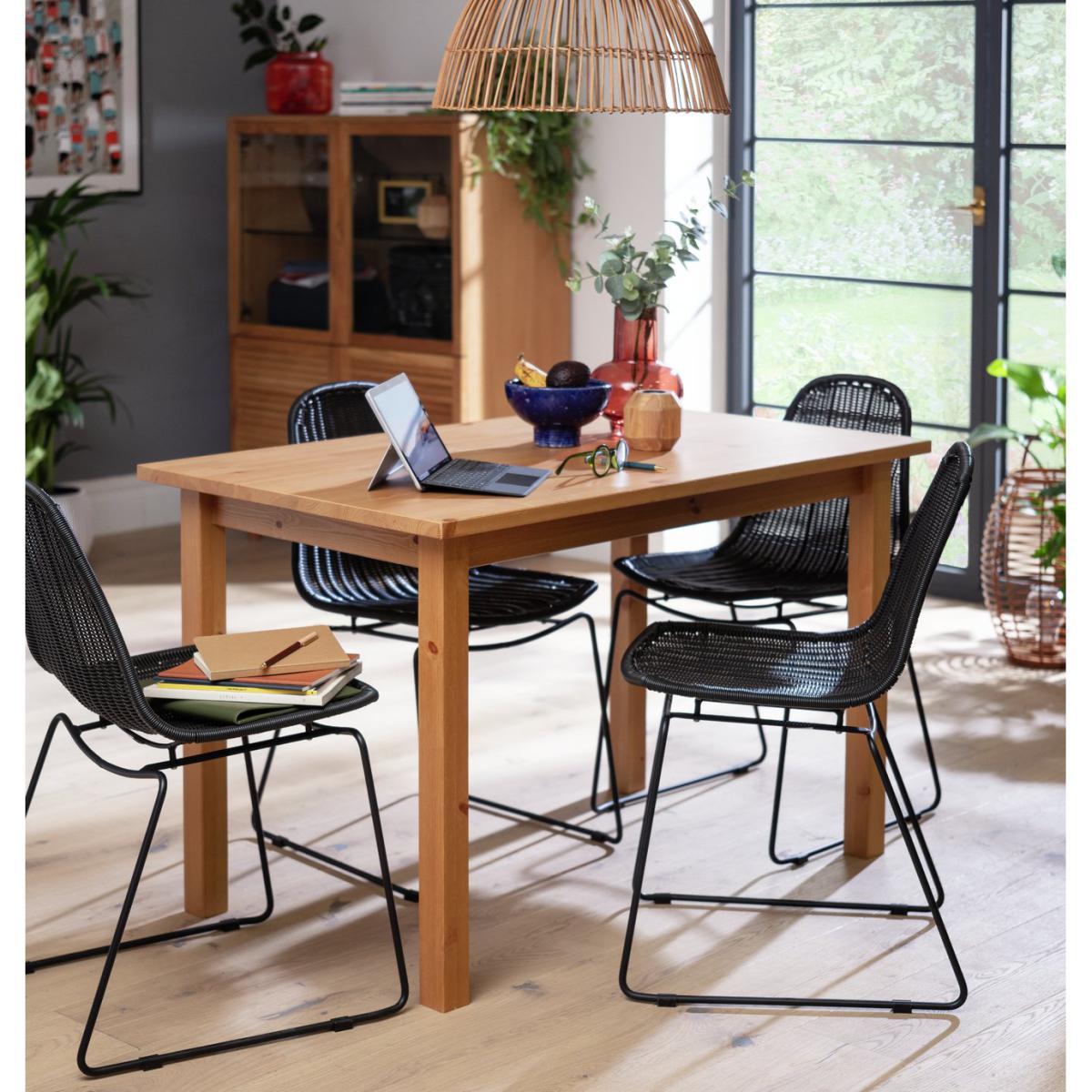 Enjoy eating in with the Habitat Ashdon. Made from hardwearing solid pine with a rich oak effect finish, this attractive dining table is ready to host all your family meals day after day. It will comfortably accommodate 4 people and is available from next day delivery, so you could be eating your dinner from it tomorrow. Nom nom.