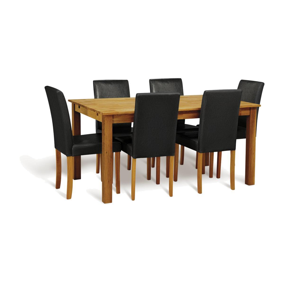 Enjoy eating in with the Habitat Ashdon. Made from hardwearing solid wood with a warm oak stain finish, this attractive dining set is ready to host all your family meals day after day. Its 6 black chairs are made with a solid wood frame to give them a sturdy build. They'll last you for years to come. Sticky fingers are no match for these wipeable upholstered padded chairs. It's available from next day delivery so you could be eating your dinner from it tomorrow. Nom nom. Part of the Ashdon collection. Table: Table size H75, W73, L150cm. Solid wood table with solid wood legs. Solid wood table top finish. Self-assembly - 2 people recommended. Chair:Includes 6 chairs. Size of each chair H92, W44, D53cm. Seat height 46cm. Solid wood frame with solid wood legs. Faux leather seat pad. Self-assembly. Maximum user weight per chair 110kg. Individual chair weight 4.9kg. Package Dimensions: Table package 1 size H11.8, W76, D156.5cm. Individual chair package size H94, W43, D25.5cm. General information:We are excited to be welcoming some of our favourite HOME products into the Habitat range. Your product may arrive in Habitat or HOME packaging. Wipe clean with a soft cloth.