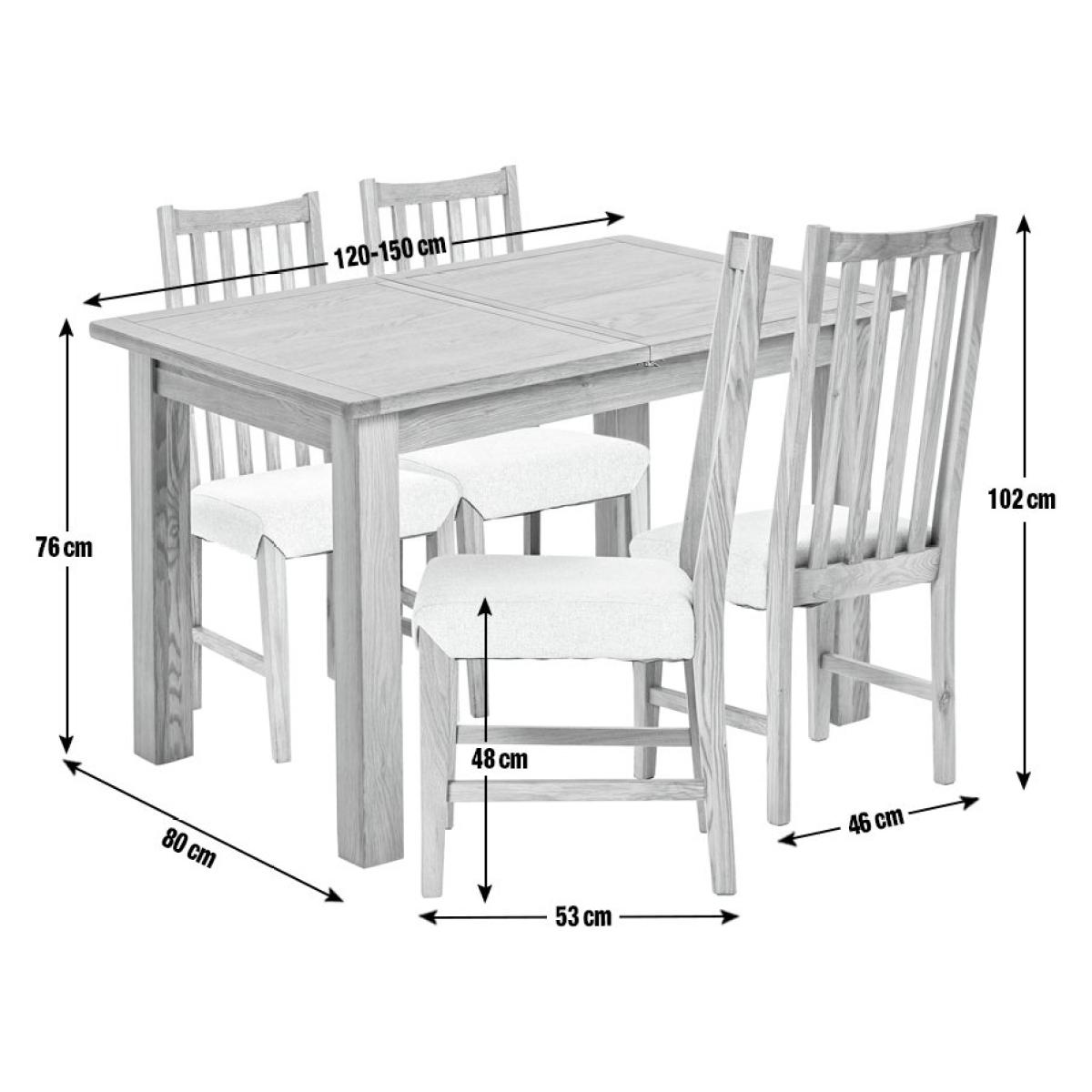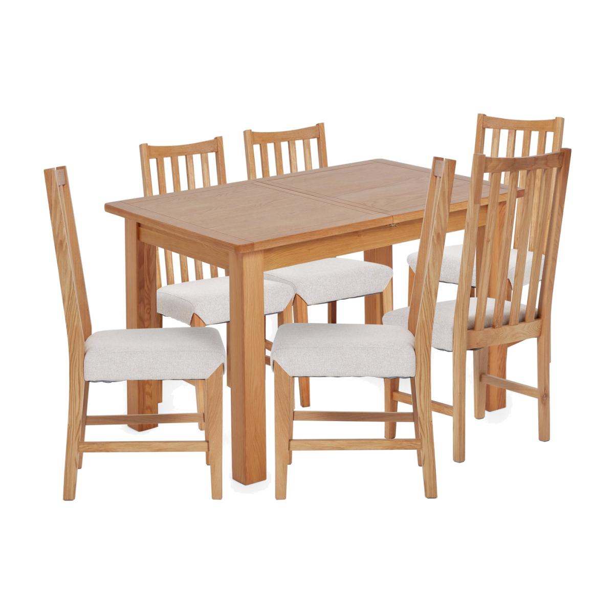 Like to eat well? You will with Ashwell. This flexible dining set comprises a table and 6 chairs. Compact for every day, it will happily seat 4 until you slide and unfold the butterfly extension. Then hey presto, a classic dining table for 6. Our table is veneered from top to bottom in an attractive light-wood grain. Chairs are fashionably high backed, with a soft, linen style neutral colour padded seat. Looks good, feels great.