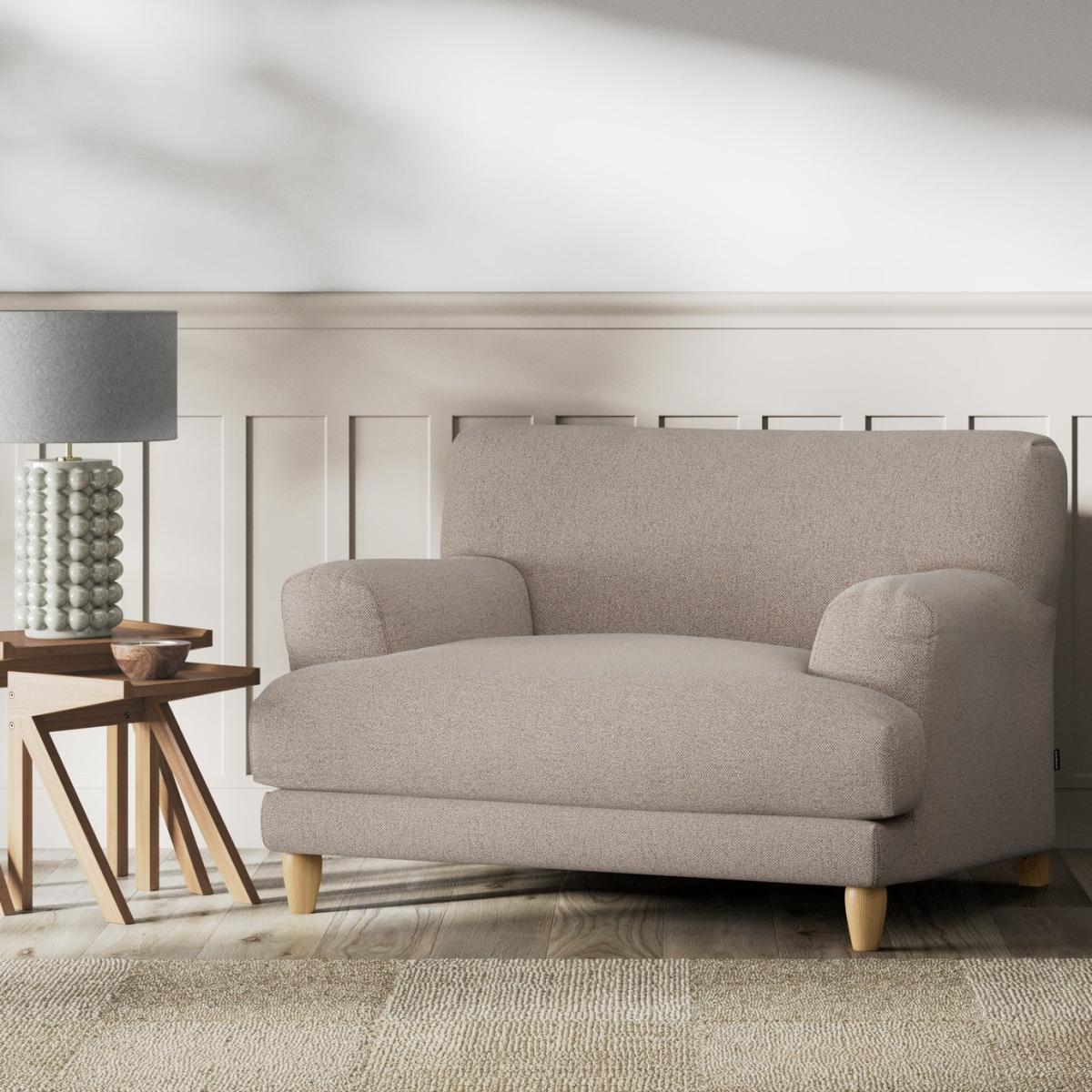 When it's made for you, you know you'll love it. Offering a contemporary take on a much-loved classic shape, the Askem cuddle chair is sinkingly soft and comfortable. Upholstered in a textured weave, the Askem takes on a soft, tactile feel. With a taller backrest for added support, wide arms and a generously padded seat and back cushion. Offering relaxed comfort, Askems cushions use high density foam, further wrapped in a thick quilted fibre wrap to create the perfect balance of support, durability and recovery. Handmade to order in the UK. The Askem uses quality materials and traditional techniques for furniture thats unique to you. Available in a choice of sizes and fabrics including Aquaclean technology protection built into the yarn, which is easy to clean with just water. Part of the Askem collection. Material: Made from 100% polyester. Wooden feet. Removable seat with fibre filling. Removable cushion(s) with fibre filling. Dimensions: Size H87, W138, D110cm. Floor to seat height: 51cm. Depth of seat: 70cm. Height of seat back: 51cm. Width of seating area between arms: 86cm. Height of arm rest: 61cm. Weight: 47kg. Packaged dimensions: Package size H92, W143, D115cm. General information: FSC certified meaning the materials used for this product are responsibly sourced. We do more than deliver your product, we unpack, set it up and take away the packaging. Manufactured in the UK using components sourced globally. Professional clean only. Plump cushions regularly to maintain shape. Manufacturer's 15 year frame guarantee.