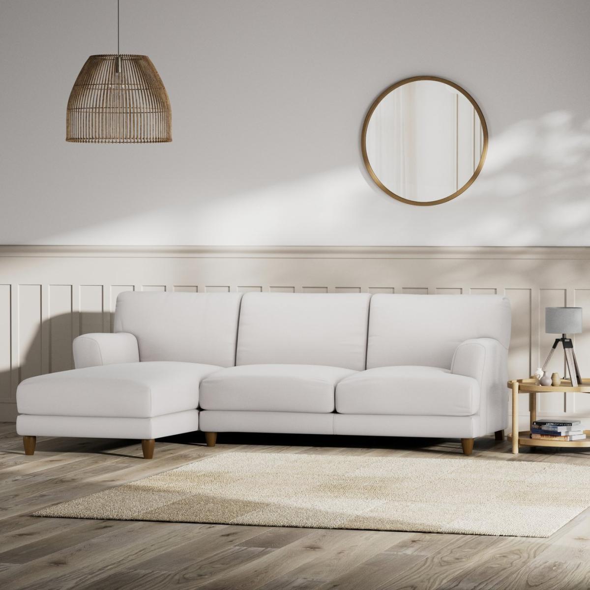 When it's made for you, you know you'll love it. Offering a contemporary take on a much-loved classic shape, the Askem 4-seater left-hand chaise is sinkingly soft and comfortable. Upholstered in Aquaclean chenille the Askem combines a soft feel with easy-clean durability With a taller backrest for added support, wide arms and generously padded seats and back cushions. Offering relaxed comfort, Askem's cushions use high density foam, further wrapped in a thick quilted fibre wrap to create the perfect balance of support, durability and recovery. Handmade to order in the UK. The Askem uses quality materials and traditional techniques for furniture that's unique to you. Available in a choice of sizes and fabrics including Aquaclean technology protection built into the yarn, which is easy to clean with just water. Part of the Askem collection. Left hand corner. Material: Made from 100% polyester. Wooden feet. Removable seats with fibre filling. Dimensions: Size H87, longer width 256,. Floor to seat height: 51cm. Depth of seat: 70cm. Height of seat back: 51cm. Longer seating area width between arms: 207cm. Height of arm rest: 61cm. Packaged dimensions: Package size H92, W167, D115cm. Second package size H92, W99, D182cm. General information: FSC certified meaning the materials used for this product are responsibly sourced. We do more than deliver your product, we unpack, set it up and take away the packaging. Manufactured in the UK using components sourced globally. Professional clean only. Plump cushions regularly to maintain shape. Manufacturer's 15 year frame guarantee.