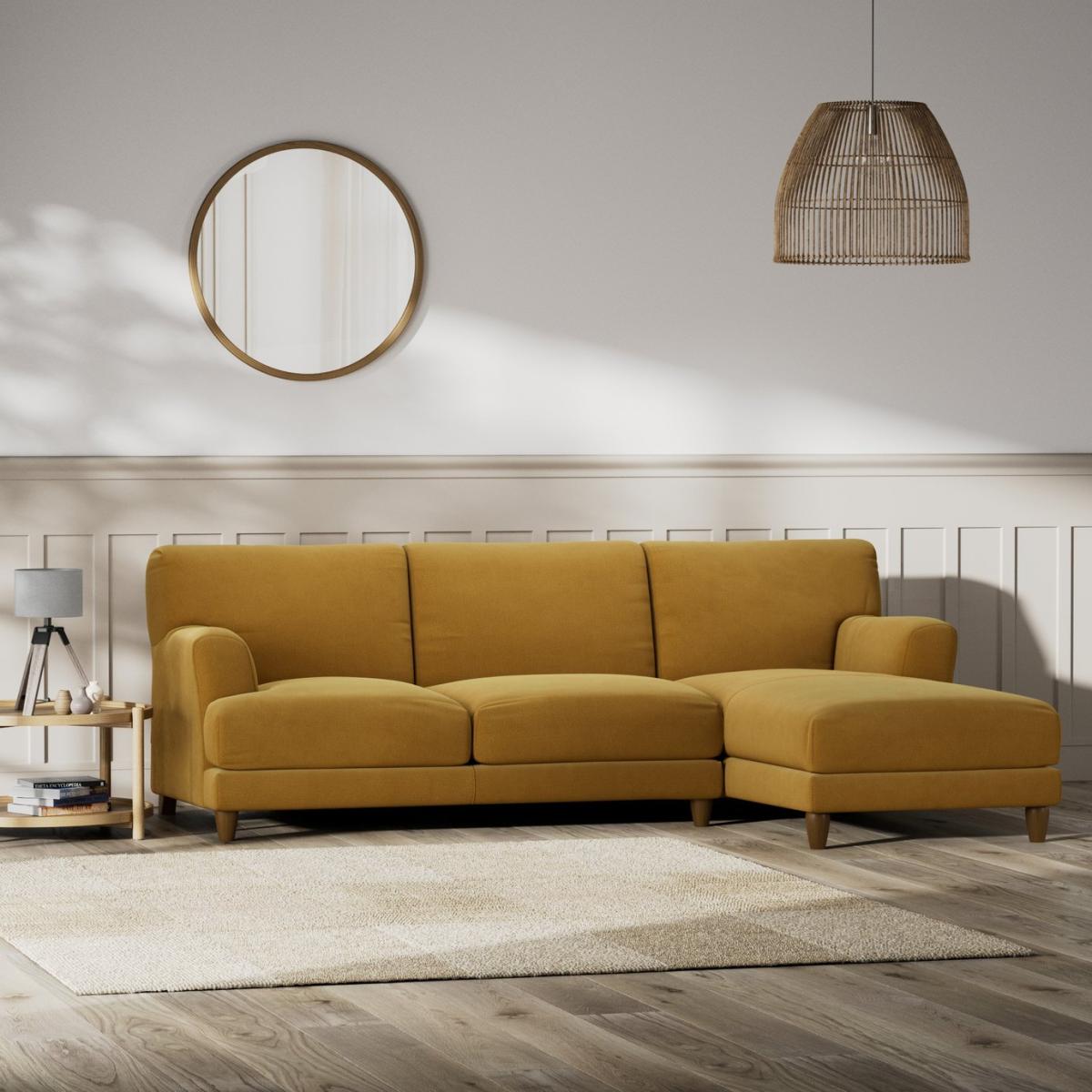 When it's made for you, you know you'll love it. Offering a contemporary take on a much-loved classic shape, the Askem 4-seater right-hand chaise is sinkingly soft and comfortable. Upholstered in a velvety sheen chenille, the Askem takes on a rich, soft, textured look. With a taller backrest for added support, wide arms and generously padded seats and back cushions. Offering relaxed comfort, Askem's cushions use high density foam, further wrapped in a thick quilted fibre wrap to create the perfect balance of support, durability and recovery. Handmade to order in the UK. The Askem uses quality materials and traditional techniques for furniture that's unique to you. Available in a choice of sizes and fabrics including Aquaclean technology protection built into the yarn, which is easy to clean with just water. Part of the Askem collection. Right hand corner. Material: Made from 100% polyester. Wooden feet. Removable seats with fibre filling. Free fabric swatch available on this line. Dimensions: Size H87, longer width 256,. Floor to seat height: 51cm. Depth of seat: 70cm. Height of seat back: 51cm. Longer seating area width between arms: 207cm. Height of arm rest: 61cm. Packaged dimensions: Package size H92, W167, D115cm. Second package size H92, W99, D182cm. General information: FSC certified meaning the materials used for this product are responsibly sourced. We do more than deliver your product, we unpack, set it up and take away the packaging. Manufactured in the UK using components sourced globally. Professional clean only. Plump cushions regularly to maintain shape. Manufacturer's 15 year frame guarantee.