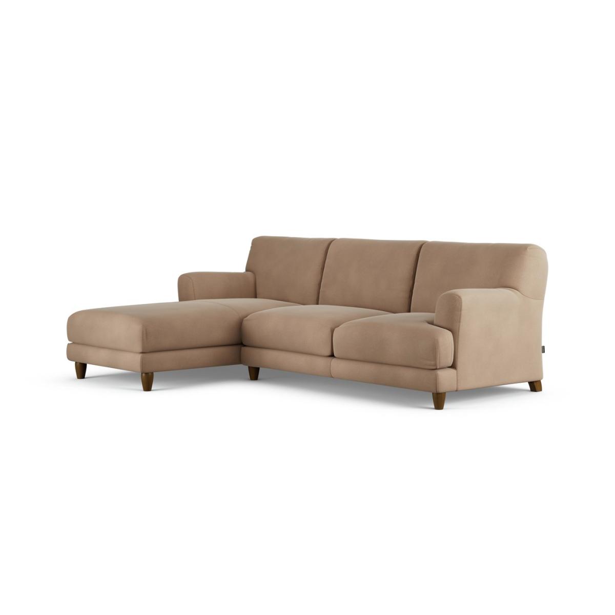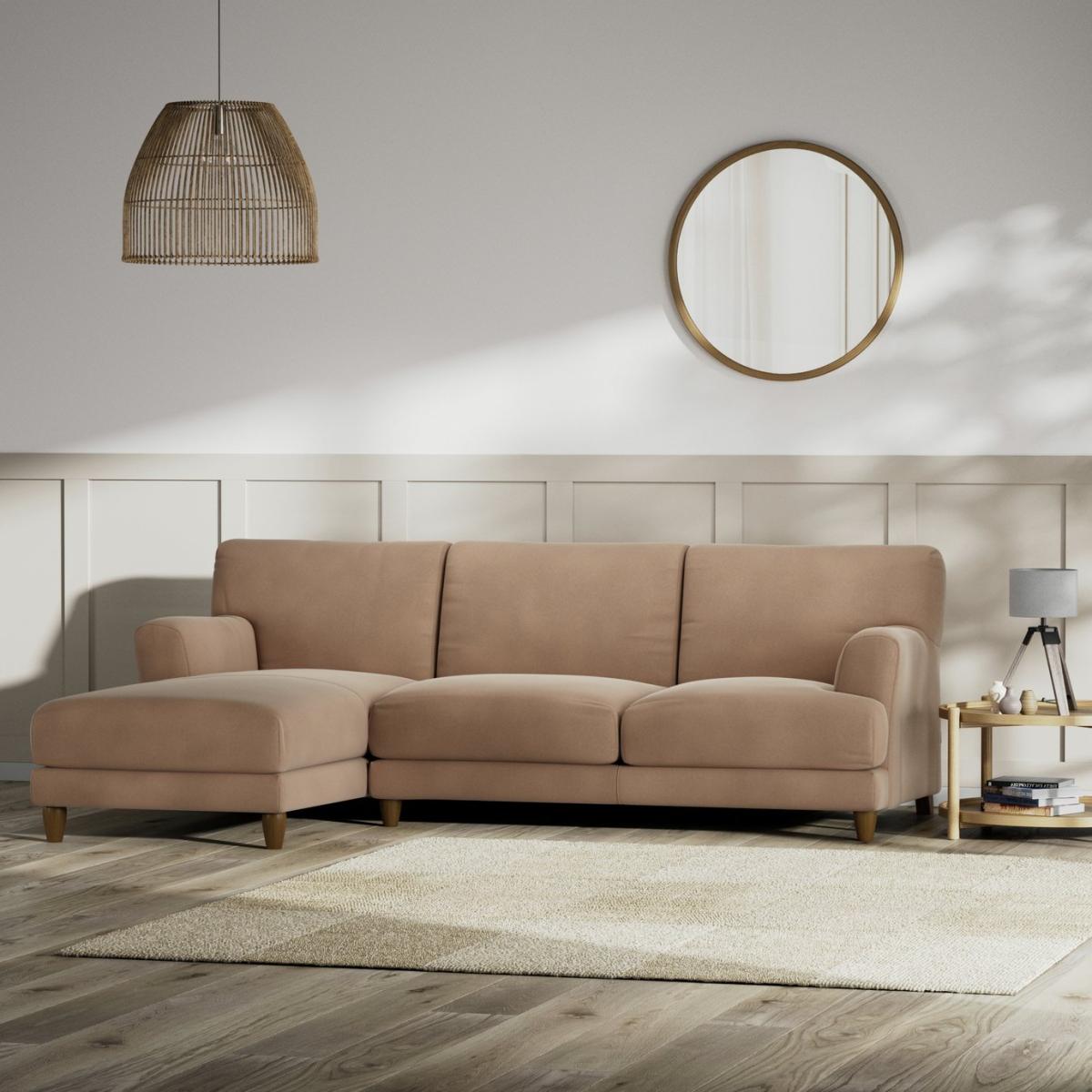 When it's made for you, you know you'll love it. Offering a contemporary take on a much-loved classic shape, the Askem 4-seater left-hand chaise is sinkingly soft and comfortable. Upholstered in a rich velvet, the Askem takes on a luxe look. With a taller backrest for added support, wide arms and generously padded seats and back cushions. Offering relaxed comfort, Askem's cushions use high density foam, further wrapped in a thick quilted fibre wrap to create the perfect balance of support, durability and recovery. Handmade to order in the UK. The Askem uses quality materials and traditional techniques for furniture that's unique to you. Available in a choice of sizes and fabrics including Aquaclean technology protection built into the yarn, which is easy to clean with just water. Part of the Askem collection. Left hand corner. Material: Made from 100% recycled polyester. Wooden feet. Removable seats with fibre filling. Dimensions: Size H87, longer width 256,. Floor to seat height: 51cm. Depth of seat: 70cm. Height of seat back: 51cm. Longer seating area width between arms: 207cm. Height of arm rest: 61cm. Packaged dimensions: Package size H92, W167, D115cm. Second package size H92, W99, D182cm. General information: We do more than deliver your product, we unpack, set it up and take away the packaging. Manufactured in the UK using components sourced globally. Professional clean only. Plump cushions regularly to maintain shape. Manufacturer's 15 year frame guarantee.