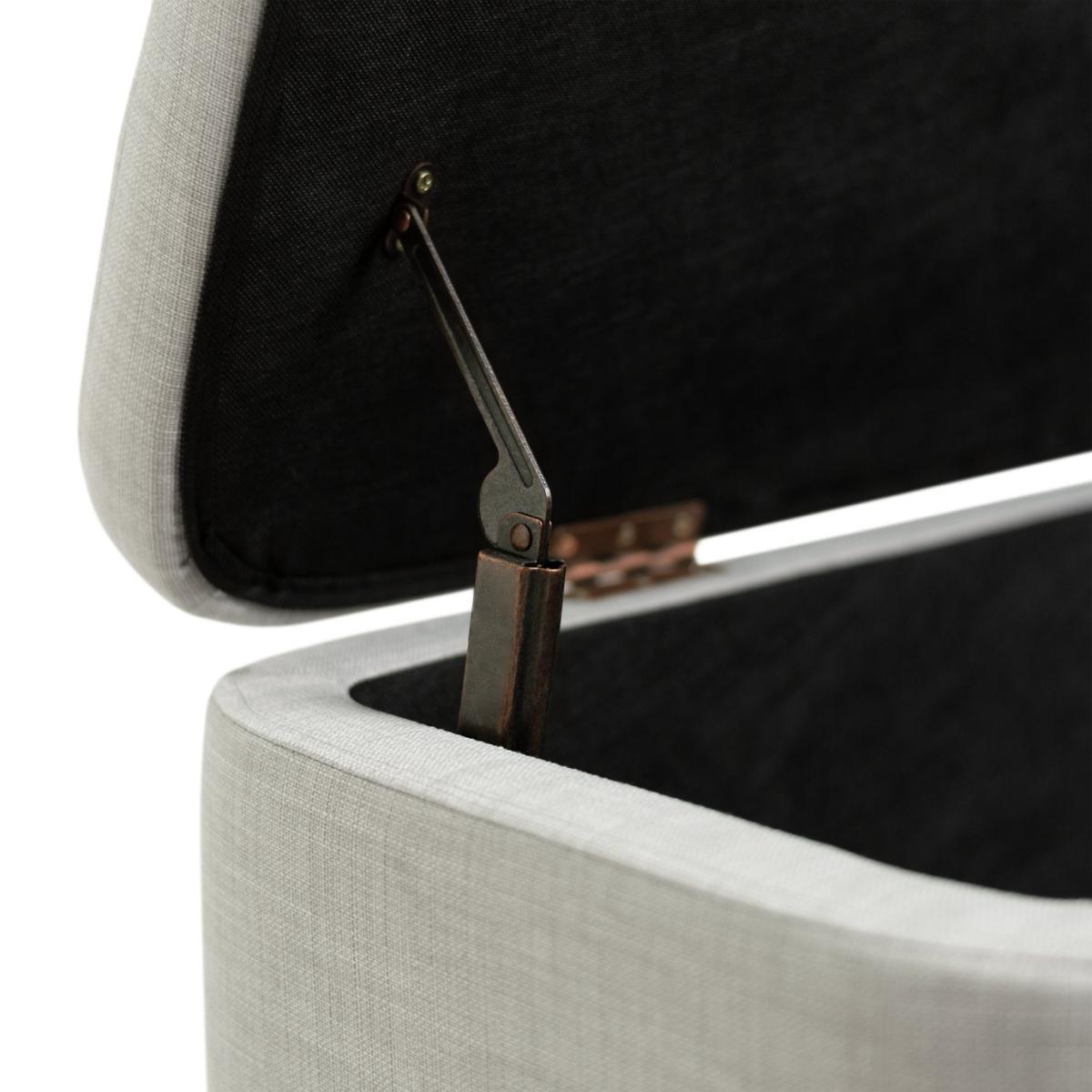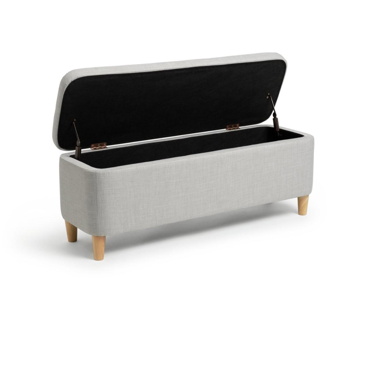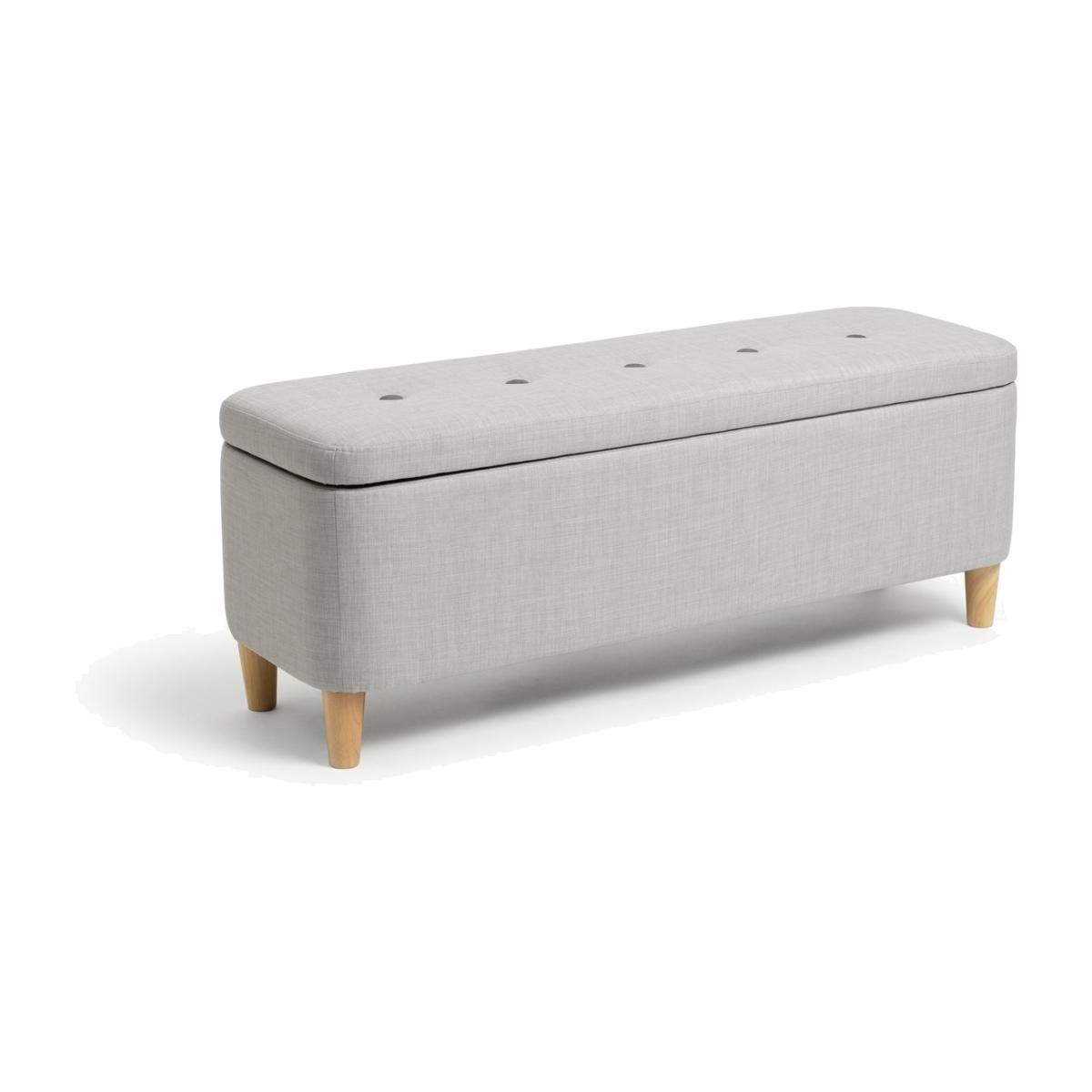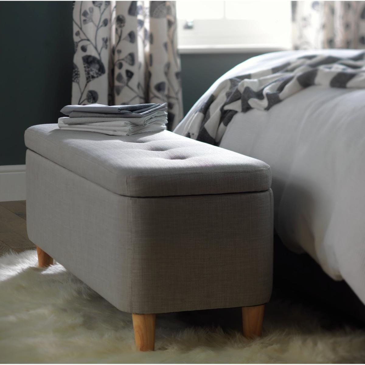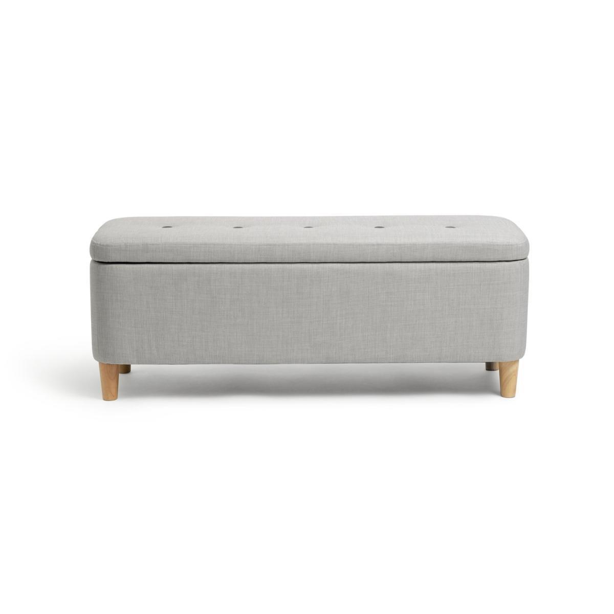 Store and sit, it's a perfect fit. This modern ottoman is simply stylishly. The natural wooden legs go so well with the cool grey fabric. It's contemporary on the outside and practical on the inside. Lift the lid and there's plenty of room inside. Perfect for a clutter free lounge. Lid closed and it's a comfy cushioned seat. Or add a dash of panache to your bedroom, and ta dah! Instant storage space for clothes or bed linen. And somewhere to sit while you're getting dressed – ooh nice.