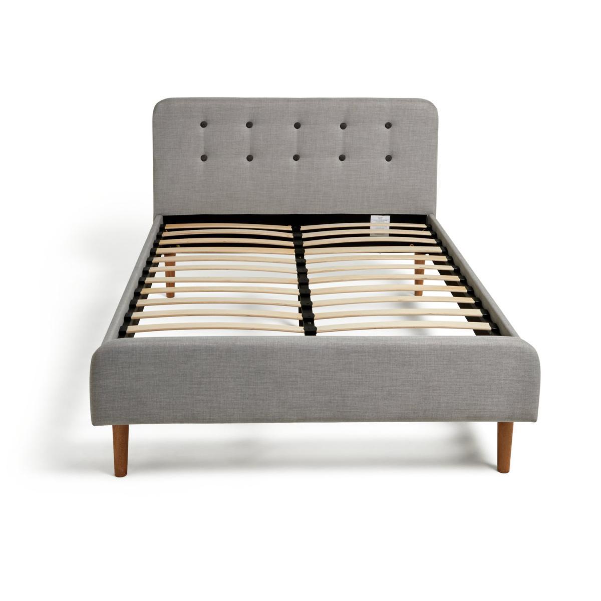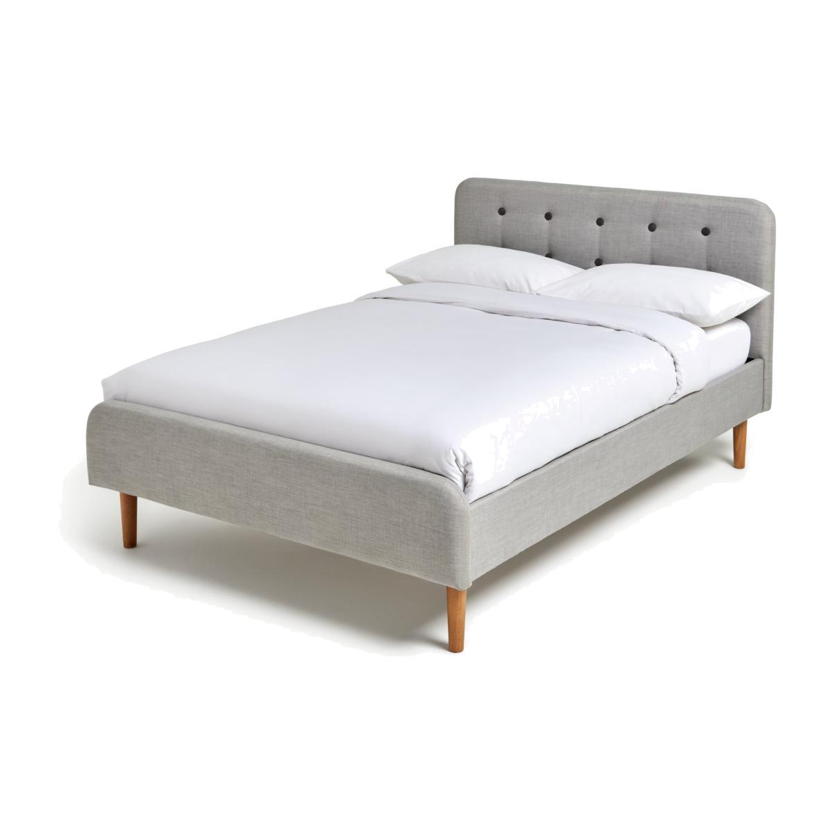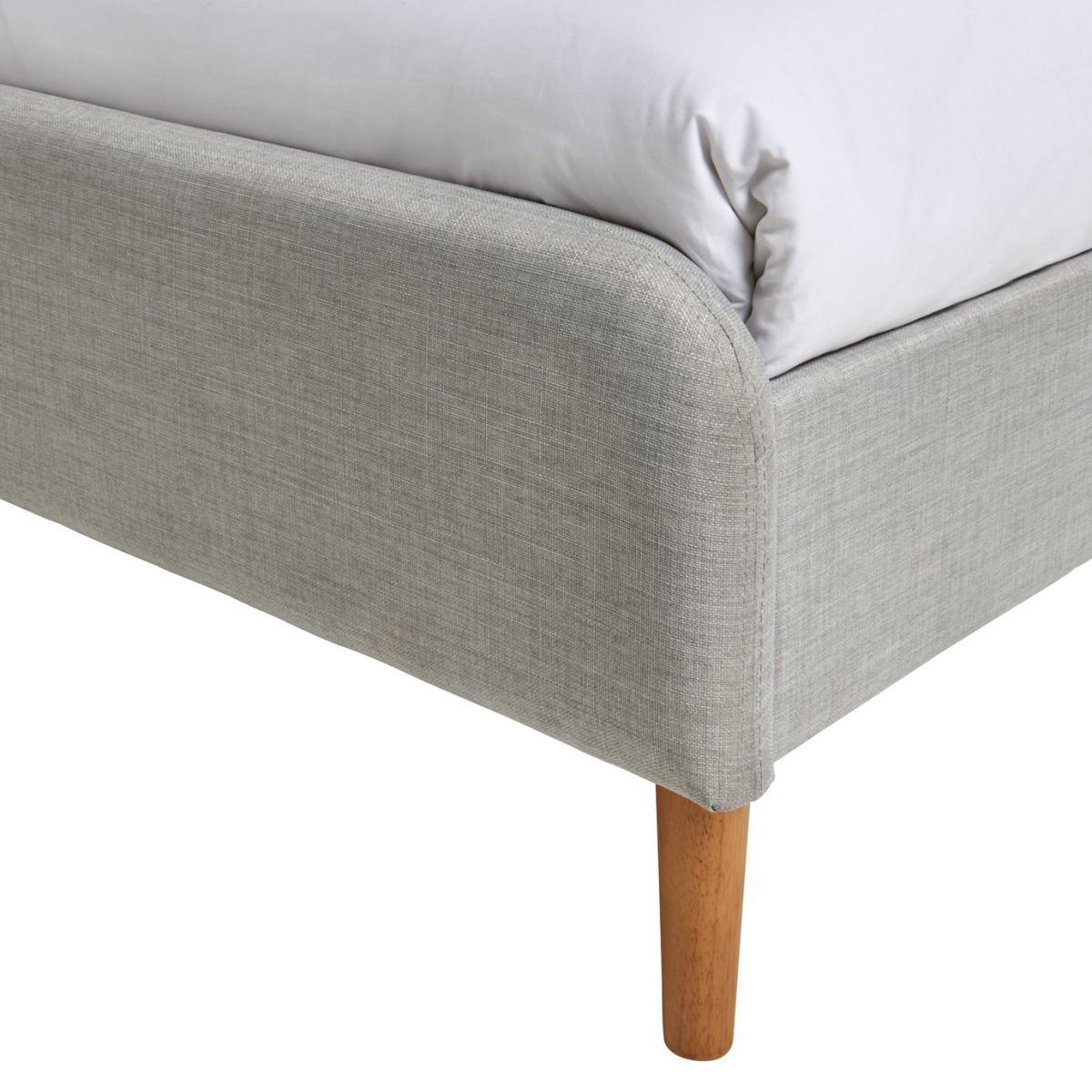 Sit up for breakfast in bed. Lean on the padded, buttoned headboard of Aspen - with matching covered frame, ahh that's nice. A low foot end means you can tuck in coversneatly, orlet your duvet or cover trail over the end - your bed, your look. Perched on tapered wooden legs with a sprung slatted base for good mattress ventilation. Aspen comes in an all over light grey fabric with a subtle woven texture and clean stitch detailing - looks good with Scandi and Mid Centurymodern themes.