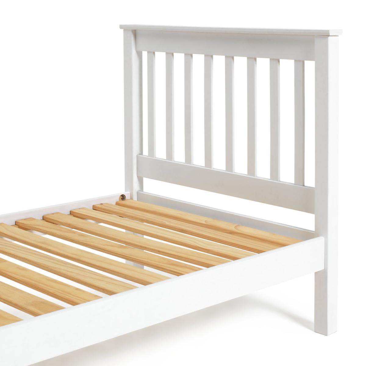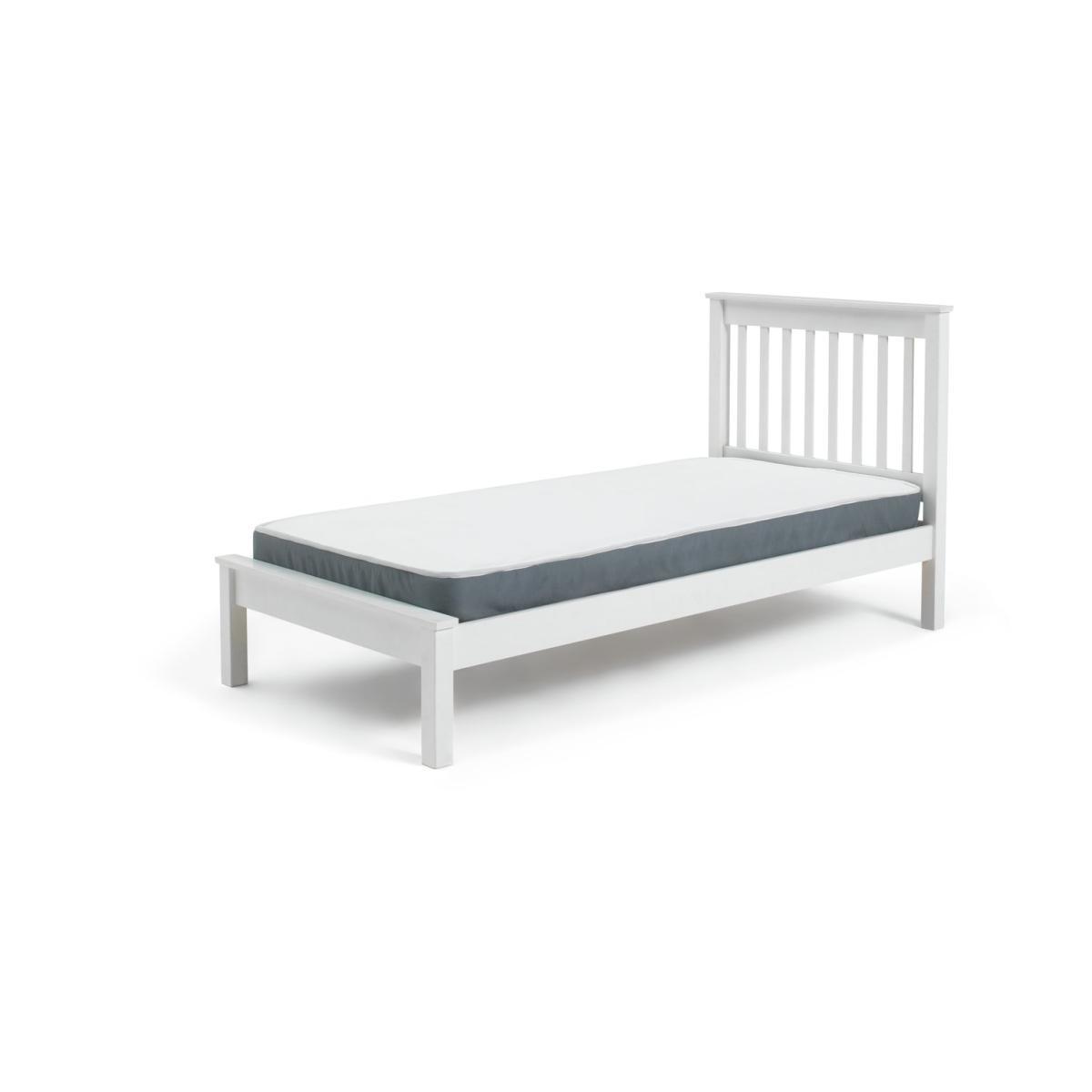 The Aspley bedframe comes complete with a Silentnight kids mattress. It's made with chunky solid pine and has a traditional shaker style shape. This grown-up design lends itself well to see your little one through the early years, right up to young adulthood. Part of the Aspley collection. Bed frame:Single bed. White bed with a mdf and solid wood frame. Includes wooden slats. Self-assembly - 2 people recommended. Maximum user weight 100kg. For ages 4 years and over. Suitable for adult use (safety tested to 100kg). Mattress:Requires 1 mattress (included). Silentnight mattress. Medium feel mattress. Open coil mattress with 323 springs. Knit cover with micro quilt finish. Anti allergy. Rotate mattress regularly. Dimensions:Frame size L202.5, W101, H102cm. Mattress size L190, W90, D15cm. Package dimensions:Package 1 size H13.8, W105.3, D102cm. Package 2 size H8.5, W192, D21cm. General information:Manufacturer's 1 year guarantee.