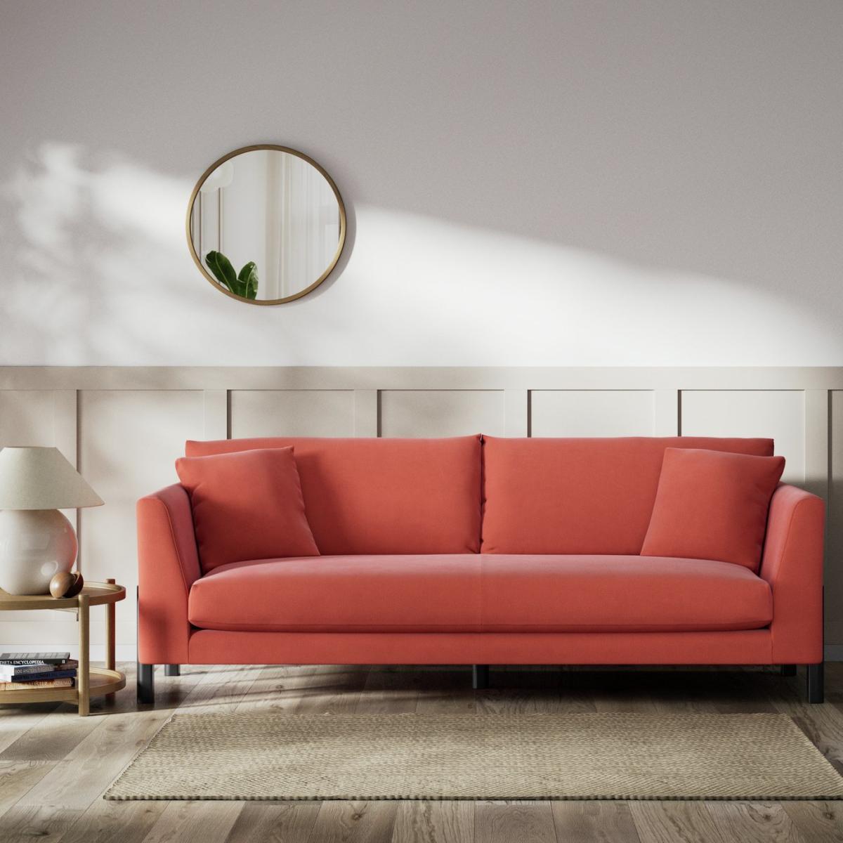 When it's made for you, you know you'll love it. Superbly blending mid-century and industrial influences the Aston 4-seater sofa with scatter cushions has showhome looks. The comfortable clean lines are emphasised by the tall, turned black legs. Upholstered in a velvety sheen Chenille, the Aston takes on a rich, soft, textured look. The low maintenance seats are filled with high density foam core wrapped in softer foam layer to create the perfect balance of support, durability and recovery. The reversible fibre filled back cushions are smartly finished with tucked corners. Hand made to order in the UK, the Aston uses quality materials and traditional techniques for furniture that's unique to you. Available in a choice of sizes and fabrics including Aquaclean technology protection built into the yarn, which is easy to clean with just water. Part of the Aston collection. Material: Made from 100% polyester. Wooden feet - black. Removable seats with foam and fibre filling. Removable cushion(s) with foam fibre wrap filling. Dimensions: Size H91, W233, D101cm. Floor to seat height: 49cm. Depth of seat: 65cm. Height of seat back: 42cm. Width of seating area between arms: 187cm. Height of arm rest: 73cm. Weight: 70kg. Packaged dimensions: Package size H61, W238, D106cm. General information: We do more than deliver your product, we unpack, set it up and take away the packaging. Manufactured in the UK using components sourced globally. Professional clean only. Plump cushions regularly to maintain shape. Manufacturer's 15 year frame guarantee.