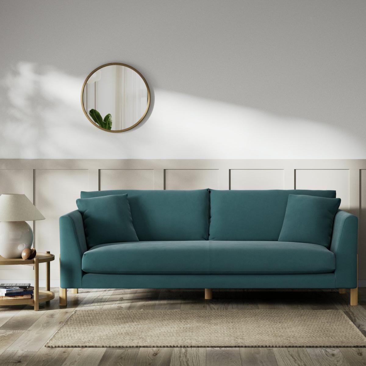 When it's made for you, you know you'll love it. Superbly blending mid-century and industrial influences the Aston 4-seater sofa with scatter cushions has showhome looks. The comfortable clean lines are emphasised by the tall, turned ash legs. Upholstered in a velvety sheen Chenille, the Aston takes on a rich, soft, textured look. The low maintenance seats are filled with high density foam core wrapped in softer foam layer to create the perfect balance of support, durability and recovery. The reversible fibre filled back cushions are smartly finished with tucked corners. Hand made to order in the UK, the Aston uses quality materials and traditional techniques for furniture that's unique to you. Available in a choice of sizes and fabrics including Aquaclean technology protection built into the yarn, which is easy to clean with just water. Part of the Aston collection. Material: Made from 100% polyester. Wooden feet - ash. Removable seats with foam and fibre filling. Removable cushion(s) with foam fibre wrap filling. Dimensions: Size H91, W233, D101cm. Floor to seat height: 49cm. Depth of seat: 65cm. Height of seat back: 42cm. Width of seating area between arms: 187cm. Height of arm rest: 73cm. Weight: 70kg. Packaged dimensions: Package size H61, W238, D106cm. General information: We do more than deliver your product, we unpack, set it up and take away the packaging. Manufactured in the UK using components sourced globally. Professional clean only. Plump cushions regularly to maintain shape. Manufacturer's 15 year frame guarantee.