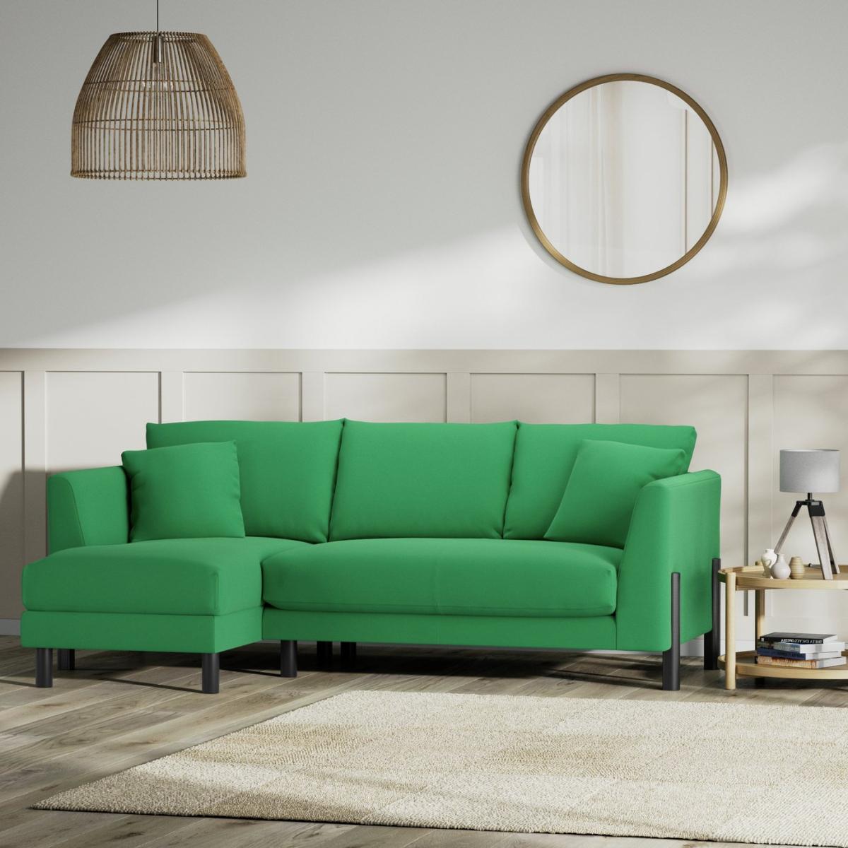 When it's made for you, you know you'll love it. Superbly blending mid-century and industrial influences the Aston 4-seater left corner chaise with scatter cushions has showhome looks. The comfortable clean lines are emphasised by the tall, turned black legs. Upholstered in Aquaclean Chenille, the Aston combines a soft feel with easy clean durability. The low maintenance seats are filled with high density foam core wrapped in softer foam layer to create the perfect balance of support, durability and recovery. The reversible fibre filled back cushions are smartly finished with tucked corners. Hand made to order in the UK, the Aston uses quality materials and traditional techniques for furniture that's unique to you. Available in a choice of sizes and fabrics including Aquaclean technology protection built into the yarn, which is easy to clean with just water. Part of the Aston collection. Left hand corner. Material: Made from 100% polyester. Wooden feet. Removable seats with foam and fibre filling. Removable cushion(s) with foam fibre wrap filling. Dimensions: Size H91, longer width 222.5, shorter width 79.5,. Floor to seat height: 49cm. Depth of seat: 65cm. Height of seat back: 42cm. Shorter seating area width between arms: 58cm. Longer seating area width between arms: 174cm. Height of arm rest: 73cm. Weight: 69kg. Packaged dimensions: Package size H61, W148, D106cm. Second package size H61, W84.5, D106cm. General information: We do more than deliver your product, we unpack, set it up and take away the packaging. Manufactured in the UK using components sourced globally. Professional clean only. Plump cushions regularly to maintain shape. Manufacturer's 15 year frame guarantee.