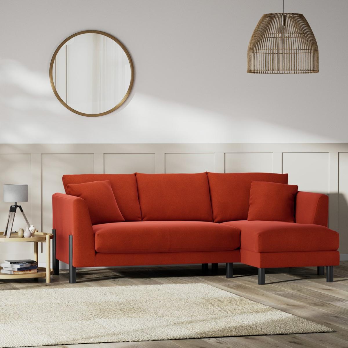 When it's made for you, you know you'll love it. Superbly blending mid-century and industrial influences the Aston 4-seater right corner chaise with scatter cushions has showhome looks. The comfortable clean lines are emphasised by the tall, turned black legs. Upholstered in rich Velvet, the Aston takes on a luxe look. The low maintenance seats are filled with high density foam core wrapped in softer foam layer to create the perfect balance of support, durability and recovery. The reversible fibre filled back cushions are smartly finished with tucked corners. Hand made to order in the UK, the Aston uses quality materials and traditional techniques for furniture that's unique to you. Available in a choice of sizes and fabrics including Aquaclean technology protection built into the yarn, which is easy to clean with just water. Part of the Aston collection. Right hand corner. Material: Made from 100% recycled polyester. Wooden feet. Removable seats with foam and fibre filling. Removable cushion(s) with foam fibre wrap filling. Dimensions: Size H91, longer width 222.5, shorter width 79.5,. Floor to seat height: 49cm. Depth of seat: 65cm. Height of seat back: 42cm. Shorter seating area width between arms: 58cm. Longer seating area width between arms: 174cm. Height of arm rest: 73cm. Weight: 69kg. Packaged dimensions: Package size H61, W148, D106cm. Second package size H61, W84.5, D106cm. General information: We do more than deliver your product, we unpack, set it up and take away the packaging. Manufactured in the UK using components sourced globally. Professional clean only. Plump cushions regularly to maintain shape. Manufacturer's 15 year frame guarantee.