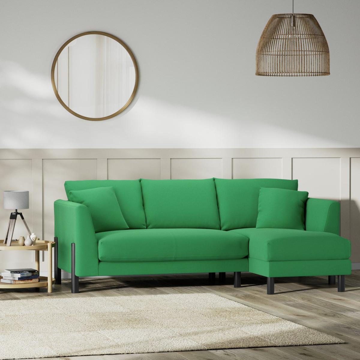 When it's made for you, you know you'll love it. Superbly blending mid-century and industrial influences the Aston 4-seater right corner chaise with scatter cushions has showhome looks. The comfortable clean lines are emphasised by the tall, turned black legs. Upholstered in Aquaclean Chenille, the Aston combines a soft feel with easy clean durability. The low maintenance seats are filled with high density foam core wrapped in softer foam layer to create the perfect balance of support, durability and recovery. The reversible fibre filled back cushions are smartly finished with tucked corners. Hand made to order in the UK, the Aston uses quality materials and traditional techniques for furniture that's unique to you. Available in a choice of sizes and fabrics including Aquaclean technology protection built into the yarn, which is easy to clean with just water. Part of the Aston collection. Right hand corner. Material: Made from 100% polyester. Wooden feet. Removable seats with foam and fibre filling. Removable cushion(s) with foam fibre wrap filling. Dimensions: Size H91, longer width 222.5, shorter width 79.5,. Floor to seat height: 49cm. Depth of seat: 65cm. Height of seat back: 42cm. Shorter seating area width between arms: 58cm. Longer seating area width between arms: 174cm. Height of arm rest: 73cm. Weight: 69kg. Packaged dimensions: Package size H61, W148, D106cm. Second package size H61, W84.5, D106cm. General information: We do more than deliver your product, we unpack, set it up and take away the packaging. Manufactured in the UK using components sourced globally. Professional clean only. Plump cushions regularly to maintain shape. Manufacturer's 15 year frame guarantee.