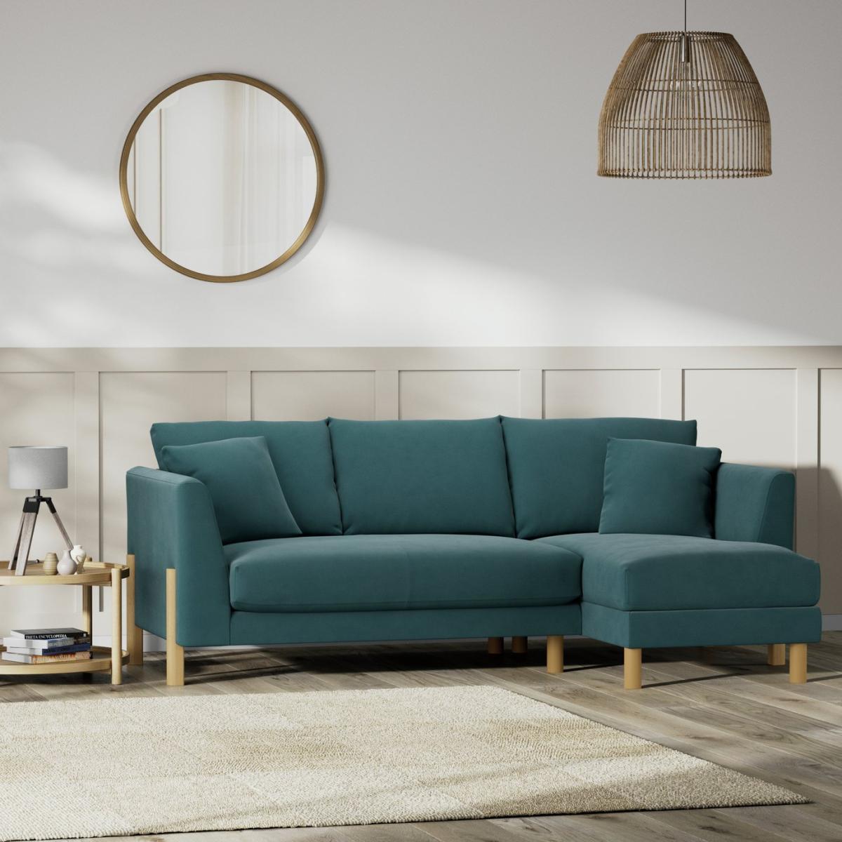 When it's made for you, you know you'll love it. Superbly blending mid-century and industrial influences the Aston 4-seater right corner chaise with scatter cushions has showhome looks. The comfortable clean lines are emphasised by the tall, turned ash legs. Upholstered in a velvety sheen Chenille, the Aston takes on a rich, soft, textured look. The low maintenance seats are filled with high density foam core wrapped in softer foam layer to create the perfect balance of support, durability and recovery. The reversible fibre filled back cushions are smartly finished with tucked corners. Hand made to order in the UK, the Aston uses quality materials and traditional techniques for furniture that's unique to you. Available in a choice of sizes and fabrics including Aquaclean technology protection built into the yarn, which is easy to clean with just water. Part of the Aston collection. Right hand corner. Material: Made from 100% polyester. Wooden feet. Removable seats with foam and fibre filling. Removable cushion(s) with foam fibre wrap filling. Dimensions: Size H91, longer width 222.5, shorter width 79.5,. Floor to seat height: 49cm. Depth of seat: 65cm. Height of seat back: 42cm. Shorter seating area width between arms: 58cm. Longer seating area width between arms: 174cm. Height of arm rest: 73cm. Weight: 69kg. Packaged dimensions: Package size H61, W148, D106cm. Second package size H61, W84.5, D106cm. General information: We do more than deliver your product, we unpack, set it up and take away the packaging. Manufactured in the UK using components sourced globally. Professional clean only. Plump cushions regularly to maintain shape. Manufacturer's 15 year frame guarantee.