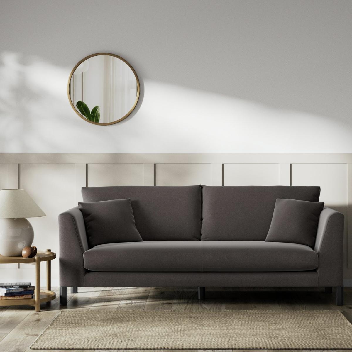When it's made for you, you know you'll love it. Superbly blending mid-century and industrial influences the Aston 3-seater sofa with scatter cushions has showhome looks. The comfortable clean lines are emphasised by the tall, turned black legs. Upholstered in rich Velvet, the Aston takes on a luxe look. The low maintenance seats are filled with high density foam core wrapped in softer foam layer to create the perfect balance of support, durability and recovery. The reversible fibre filled back cushions are smartly finished with tucked corners. Hand made to order in the UK, the Aston uses quality materials and traditional techniques for furniture that's unique to you. Available in a choice of sizes and fabrics including Aquaclean technology protection built into the yarn, which is easy to clean with just water. Part of the Aston collection. Material: Made from 100% recycled polyester. Wooden feet - black. Removable seats with foam and fibre filling. Removable cushion(s) with foam fibre wrap filling. Dimensions: Size H91, W213, D101cm. Floor to seat height: 49cm. Depth of seat: 65cm. Height of seat back: 42cm. Width of seating area between arms: 167cm. Height of arm rest: 73cm. Weight: 62.5kg. Packaged dimensions: Package size H61, W218, D106cm. General information: We do more than deliver your product, we unpack, set it up and take away the packaging. Manufactured in the UK using components sourced globally. Professional clean only. Plump cushions regularly to maintain shape. Manufacturer's 15 year frame guarantee.