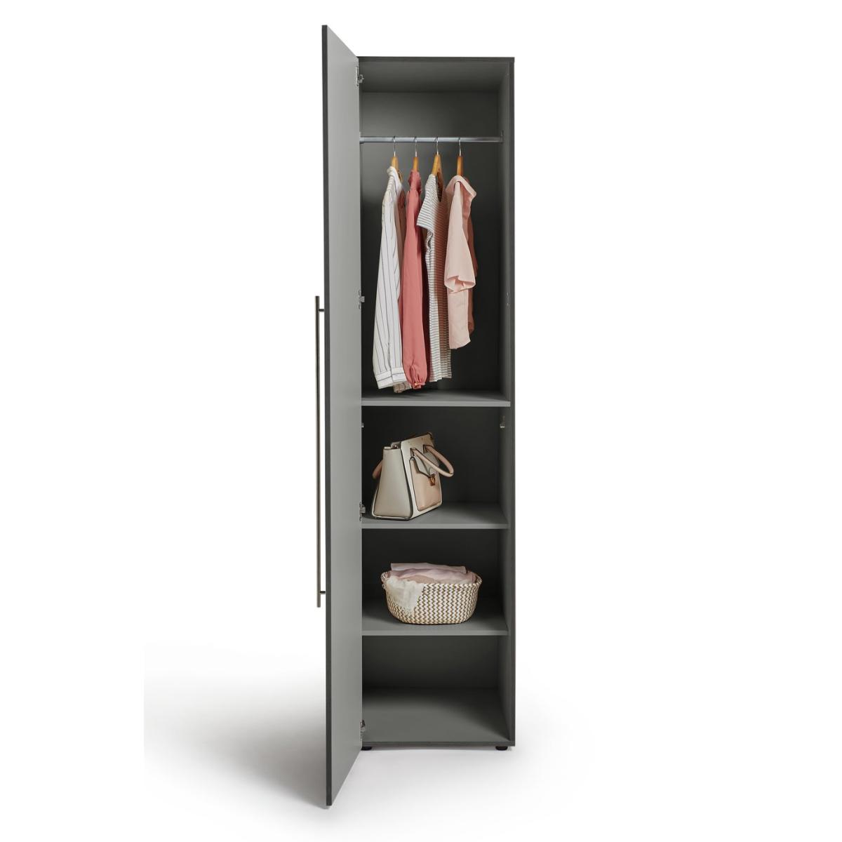 Looking for a slimline wardrobe? The impressive 1-door Atlas wardrobe is the answer. Smart too, in a charcoal wood shade with a long matte black coloured handle. Inside there's an adjustable shelf and 2 adjustable hanging rails, so you can arrange the interior to suit your needs. Giving your bedroom a makeover? Check out our collection of rugs, lamps, and bedlinen to complement your decor. Part of the Atlas collection. Made of wood effect. Metal handles. 1 door. 2 adjustable hanging rails. Hanging rail holds up to 7kg. 1 adjustable shelf. Self-assembly - 2 people recommended. If this product is over 60cm high it must be securely attached to the wall to prevent overturning. Dimensions: Size H213, W50, D60cm. Internal hanging space H171, W46.8, D59cm. Handle size: L85, W1cm. Weight 45kg. Package Dimensions: Package 1 dimensions: H215, W60, D8cm. Package 1 weight: 34kg. Package 2 dimensions: H219, W51, D2cm. Package 2 weight: 11kg. FSC certified meaning the materials used for this product are responsibly sourced. General information: We are excited to be welcoming some of our favourite HOME products into the Habitat range. Your product may arrive in Habitat or HOME packaging. Manufacturer's 1 year guarantee.