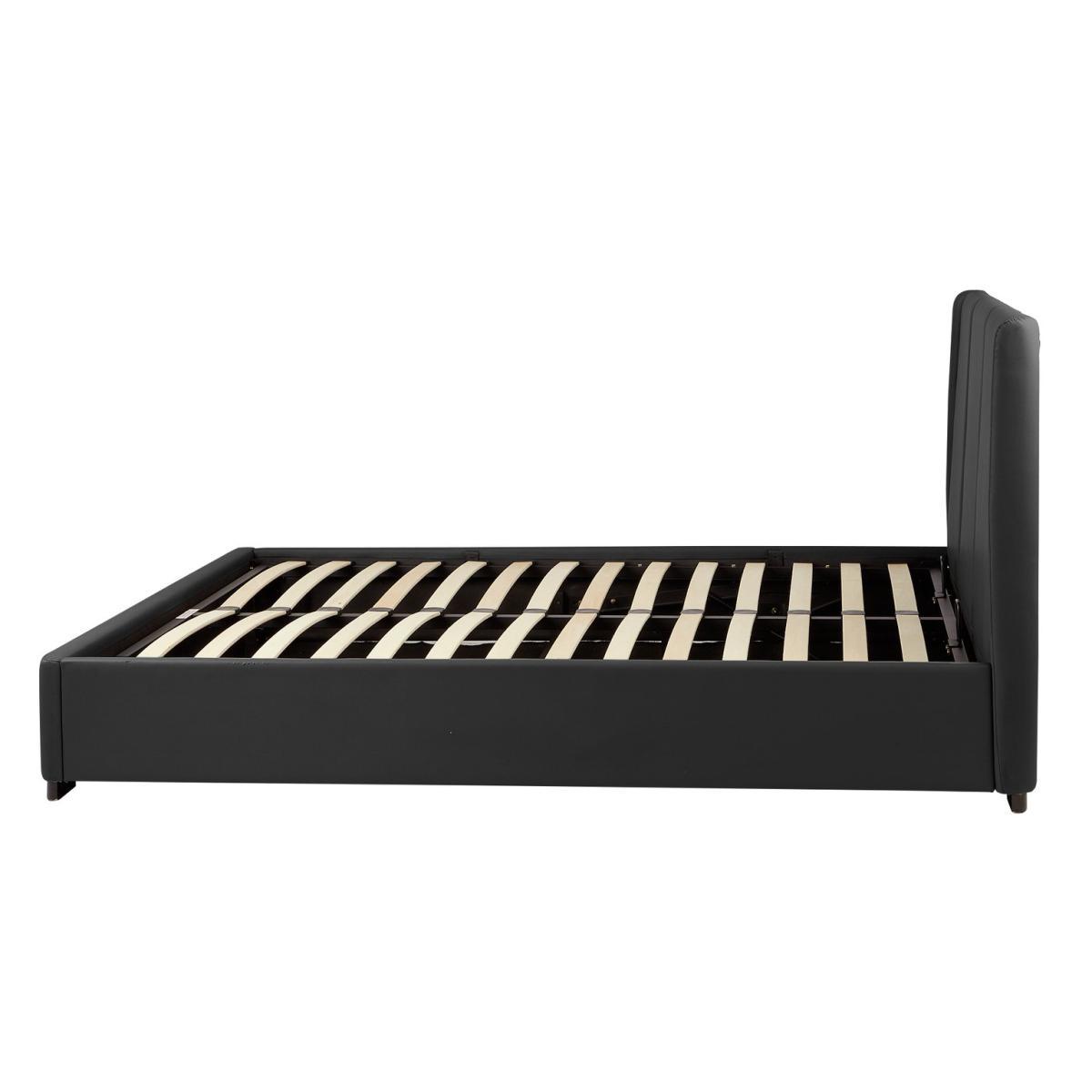 It's bedtime. Time to meet our Austen ottoman king size frame designed to create a clean, uncluttered bedroom vibe. Pop it open from the foot of the bed using the ingenious gas-lift mechanism and hey presto, loads of underbed storage appears. Hide all your extra linen and duvets, surplus clothes or long-term papers there. A soft black faux leather headboard and covered metal frame is sturdy, comfy and contemporary. And sprung wooden slats provide long-lasting comfort and mattress support. Sleep well.
