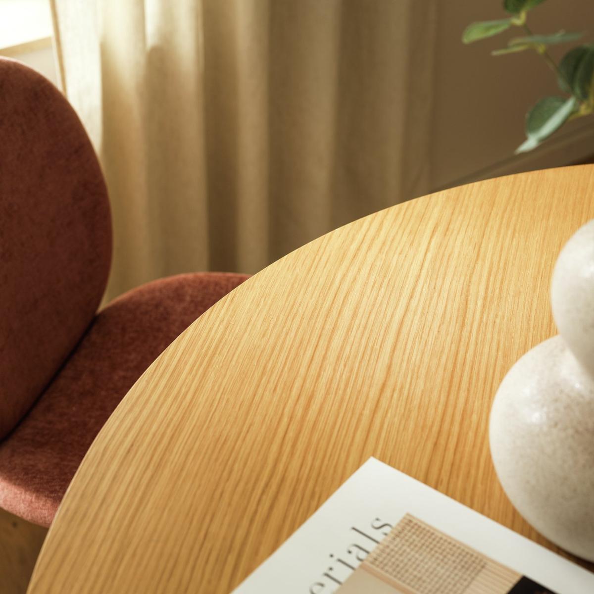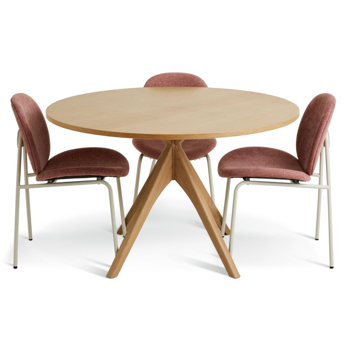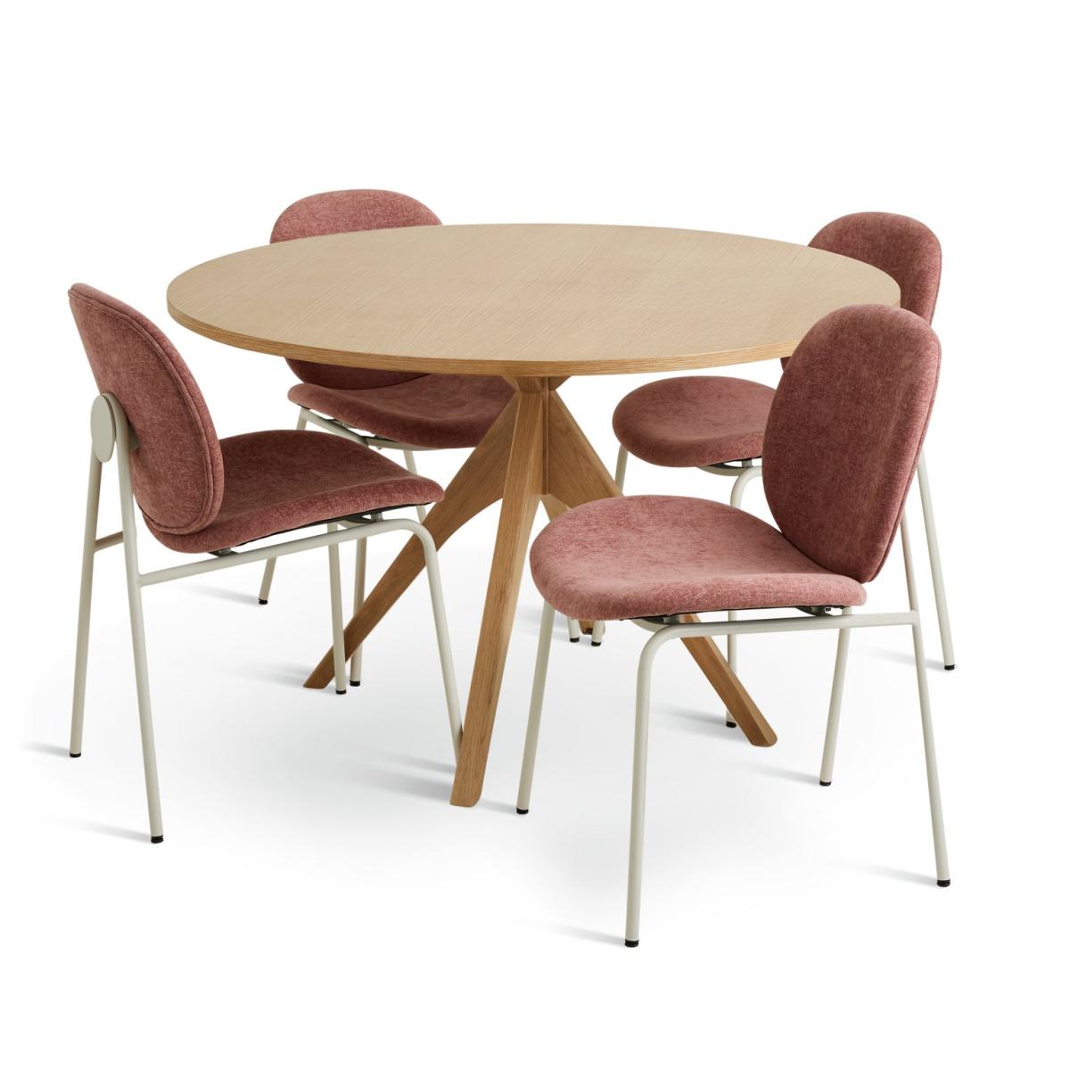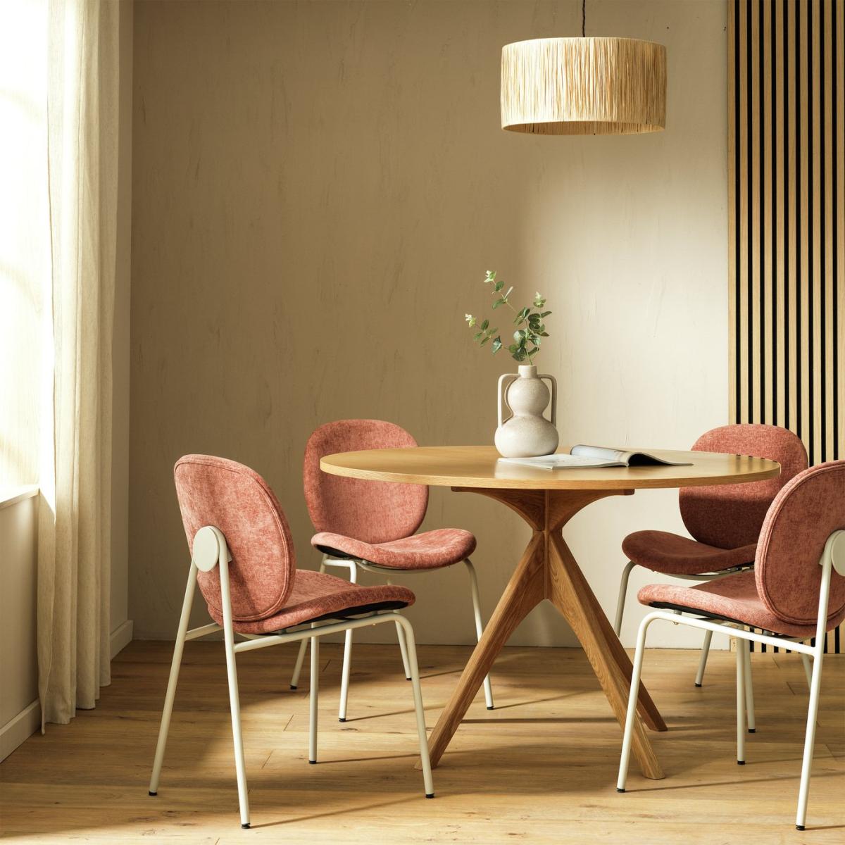 Modern country style with a touch of drama. Our Austin round dining table is perfect for bringing family and friends together. The solid oak top is warm and welcoming, and the pedestal base with splayed legs add a theatrical twist. Four dining chairs with soft pink fabric cushioning, curved backs and white metal legs dial up the contemporary feel. Pull up a seat. Part of the Austin collection. Table: Table size H75, D120cm. Real wood veneer table with solid wood legs. Self-assembly - 2 people recommended. Chair: Includes 4 chairs. Size of each chair H81.5, W49, D56cm. Metal frame with metal legs. Fabric seat pad. Self-assembly. Maximum user weight per chair 130kg. Individual chair weight 6.6kg. Package Dimensions: Table package 1 size H13, W132, D9.5cm. Individual chair package size H32.5, W49.5, D67cm. General information: Manufacturer's 1 year guarantee. Wipe clean with a damp cloth. By choosing FSC certified products, you are supporting responsible management of the world's forests.