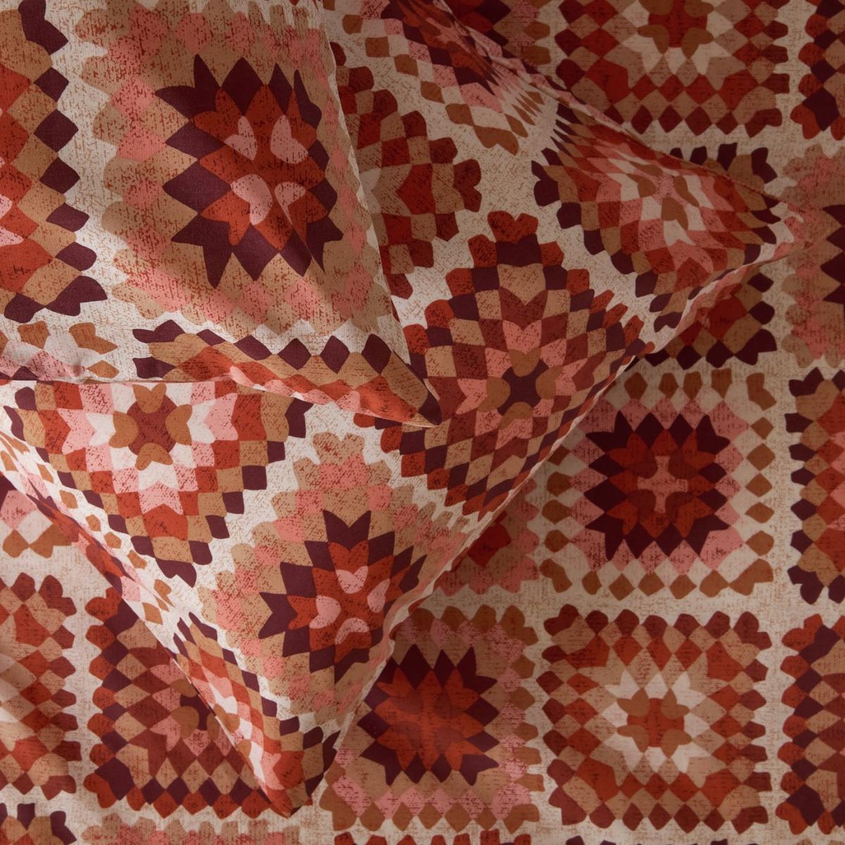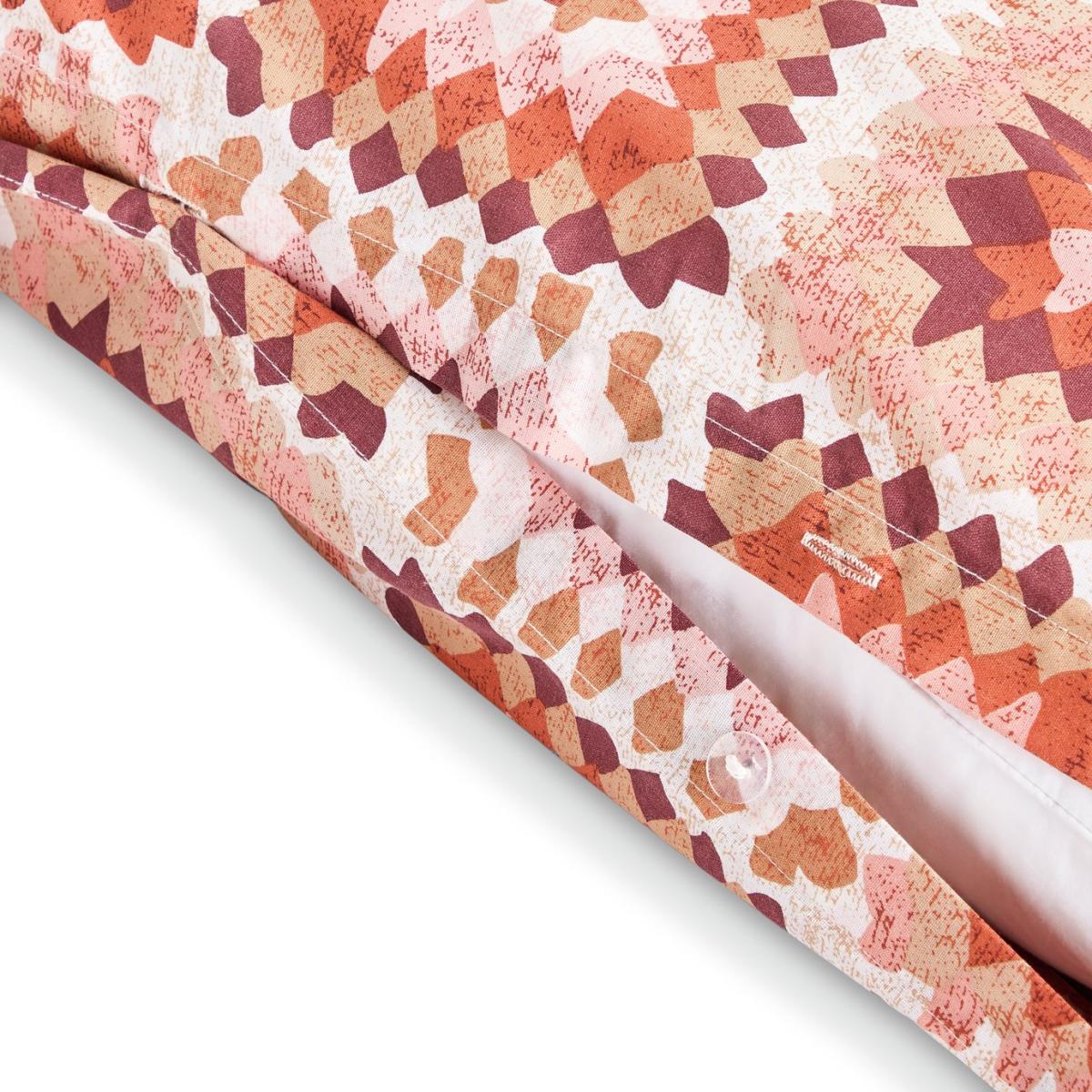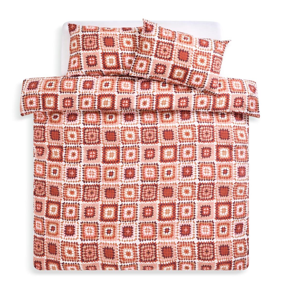 Crafted comfort for crisp autumn nights. Our crochet-inspired kingsize bedding set weaves together burnt orange tones and nostalgic patterns creating a cosy homespun feel. Curl up as the nights draw in, soft, breathable and full of country cottage charm. Layer it up, settle in, let the leaves fall. This item carries the STANDARD 100 by OEKO-TEX logo, which means you can be certain that every component has been tested for harmful substances and is therefore harmless to human health. 52% polyester, 48% cotton. 144 thread count. Set includes 1 duvet cover and 2 pillowcases. Bed size: king size. Length 220cm, Width 230cm. Reversible. Buttons for fastening. Standard pillowcase (s). Pillowcase length 75cm, Width 50cm. Reversible pillowcase (s). Wash before use. Suitable for tumble drying.
