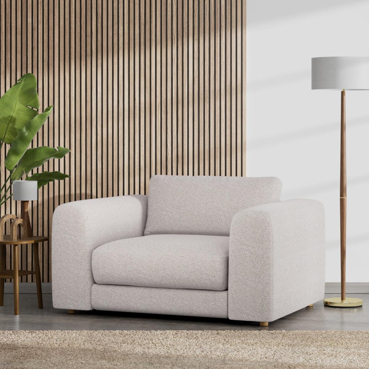 When it's made for you, you know you'll love it. Deeply inviting, the Ayr cuddle chair has a generous low and boxy style that combines classic comfort with contemporary living. Upholstered in a textured weave, the Ayr takes on a soft, tactile feel. From the arms wide enough to rest a laptop, to the generously padded seat and cushions, this cuddle chair is all about laid back lounging. Offering relaxed comfort, Ayr cushions use high density foam, further wrapped in a thick quilted fibre wrap to create the perfect balance of support, durability and recovery. Handmade to order in the UK. The Ayr uses quality materials and traditional techniques for furniture thats unique to you. Available in a choice of sizes and fabrics including Aquaclean technology protection built into the yarn, which is easy to clean with just water. Part of the Ayr collection. Material: Made from 100% polyester. Wooden feet. Removable seat with foam fibre wrap filling. Removable cushion(s) with foam fibre wrap filling. Dimensions: Size H83, W143, D113cm. Floor to seat height: 44cm. Depth of seat: 75cm. Height of seat back: 43cm. Width of seating area between arms: 83cm. Height of arm rest: 70cm. Weight: 61kg. Packaged dimensions: Package size H69, W148, D118cm. General information: FSC certified meaning the materials used for this product are responsibly sourced. We do more than deliver your product, we unpack, set it up and take away the packaging. Manufactured in the UK using components sourced globally. Professional clean only. Plump cushions regularly to maintain shape. Manufacturer's 15 year frame guarantee.