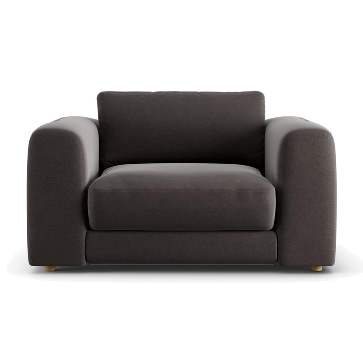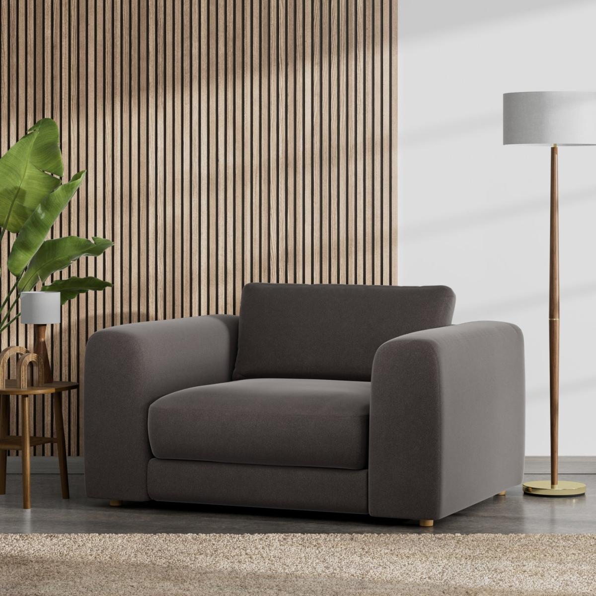 When it's made for you, you know you'll love it. Deeply inviting, the Ayr cuddle chair has a generous low and boxy style that combines classic comfort with contemporary living. Upholstered in a rich velvet, the Ayr takes on a luxe look. From the arms wide enough to rest a laptop, to the generously padded seat and cushions, this cuddle chair is all about laid back lounging. Offering relaxed comfort, Ayr cushions use high density foam, further wrapped in a thick quilted fibre wrap to create the perfect balance of support, durability and recovery. Handmade to order in the UK. The Ayr uses quality materials and traditional techniques for furniture thats unique to you. Available in a choice of sizes and fabrics including Aquaclean technology protection built into the yarn, which is easy to clean with just water. Part of the Ayr collection. Material: Made from 100% recycled polyester. Wooden feet. Removable seat with foam fibre wrap filling. Removable cushion(s) with foam fibre wrap filling. Dimensions: Size H83, W143, D113cm. Floor to seat height: 44cm. Depth of seat: 75cm. Height of seat back: 43cm. Width of seating area between arms: 83cm. Height of arm rest: 70cm. Weight: 61kg. Packaged dimensions: Package size H69, W148, D118cm. General information: FSC certified meaning the materials used for this product are responsibly sourced. We do more than deliver your product, we unpack, set it up and take away the packaging. Manufactured in the UK using components sourced globally. Professional clean only. Plump cushions regularly to maintain shape. Manufacturer's 15 year frame guarantee.