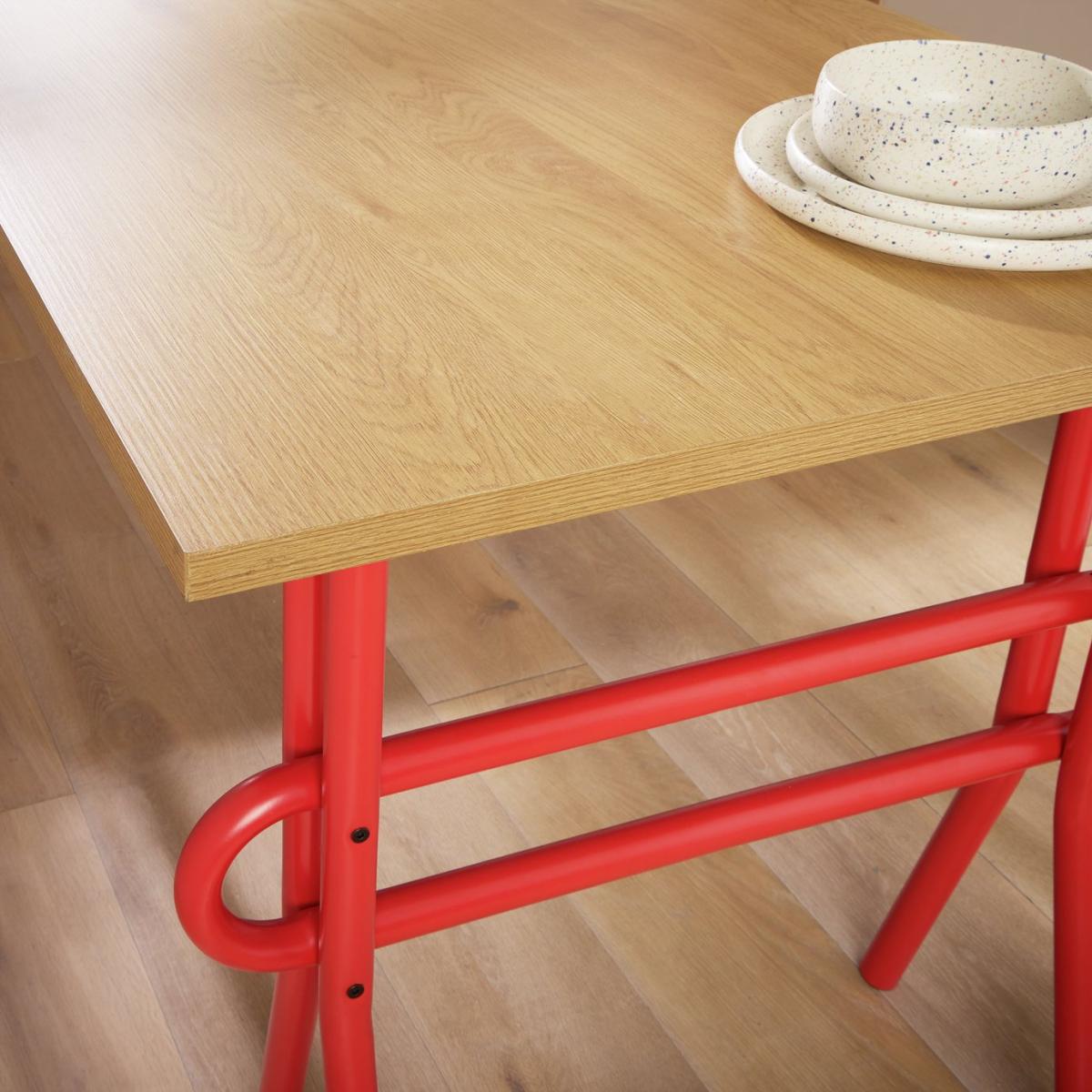 Table for two? Our Ballon metal dining table is all industrial edge meets easy going charm. Streamlined and sturdy, a painted red frame provides the muscle. The oak-effect surface makes the table top warm and welcoming. Ready to host morning coffees to late-night takeaways. And it's a great fit for those work from home days. Part of the Ballon collection. Table: Table size: H74.5, L180, W80cm. Internal size between table legs L120, W51.6cm. Wood effect table with metal legs. Wood effect table top finish. Self-assembly - 2 people recommended. Weight of table 35kg. Package Dimensions: Table packaging size: H11, W191, D88cm. General information: By choosing FSC certified products, you are supporting responsible management of the world's forests. Manufacturer's 1 year guarantee.