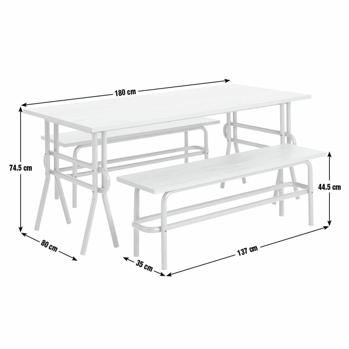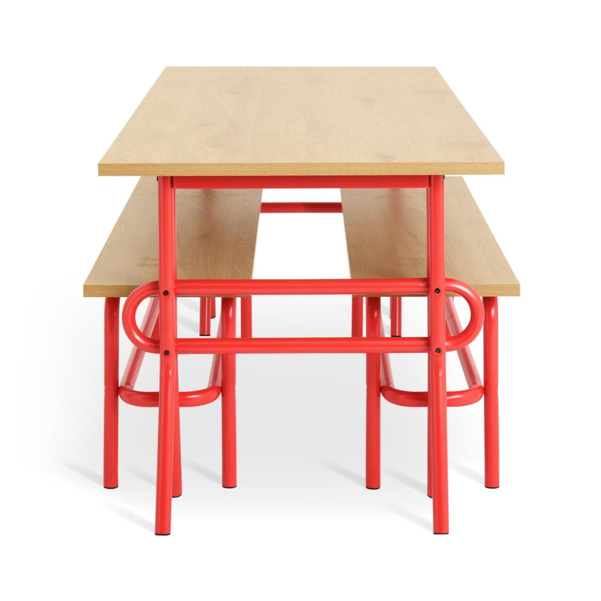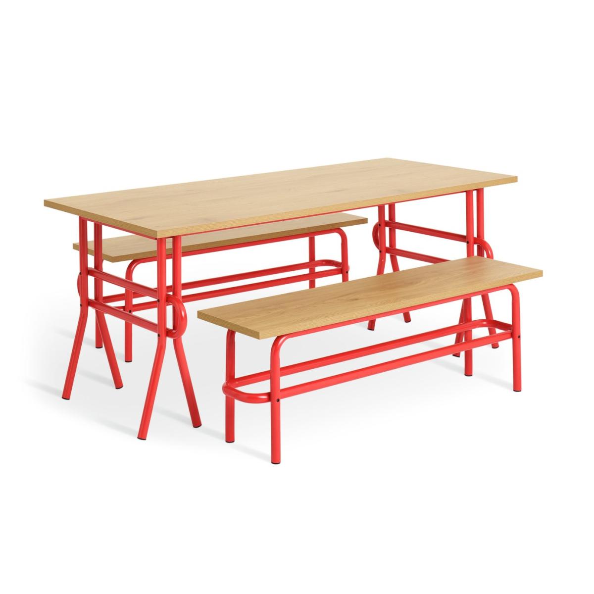 Pull up a pew... Or two. Our strong but light Ballon dining set features carefully rounded red tubular steel frames topped with warm and welcoming oak look surfaces. With two, 3-seater benches, you can comfortably seat 4. Tough enough to withstand family life, Ballon is also smart enough to host morning coffees to late-night takeaways and everything in between. Part of the Ballon collection. Table: Table size H74.5, W80, L180cm. Wood effect table with metal legs. Wood effect table top finish. Self-assembly - 2 people recommended. Chair: Maximum user weight per chair 100kg. Individual chair weight 13.9kg. Bench: Includes 2 benches. Bench size H44.5, W137, D35cm. Made from metal. Wood effect finish. Self-assembly. Bench weight 13.9kg. Package Dimensions: Table package 1 size H11, W191, D88cm. General information: Manufacturer's 1 year guarantee. Wipe clean. By choosing FSC certified products, you are supporting responsible management of the world's forests.