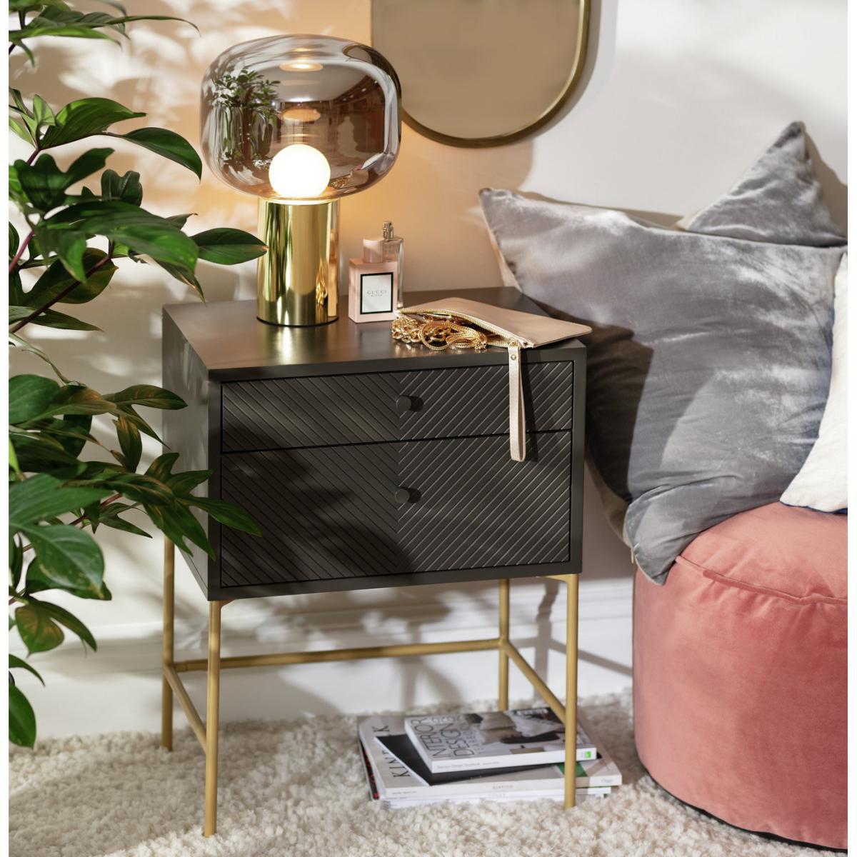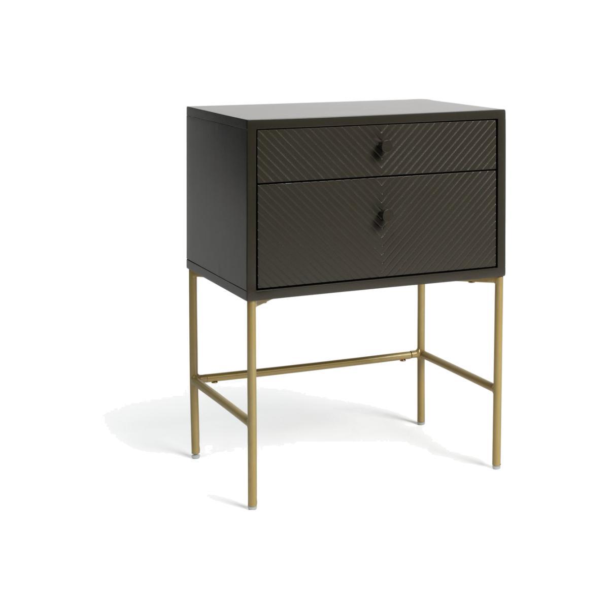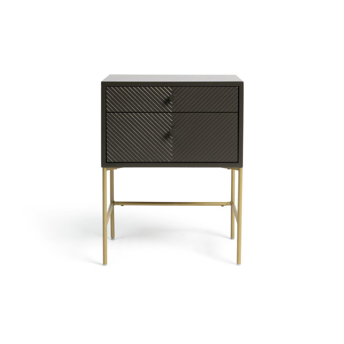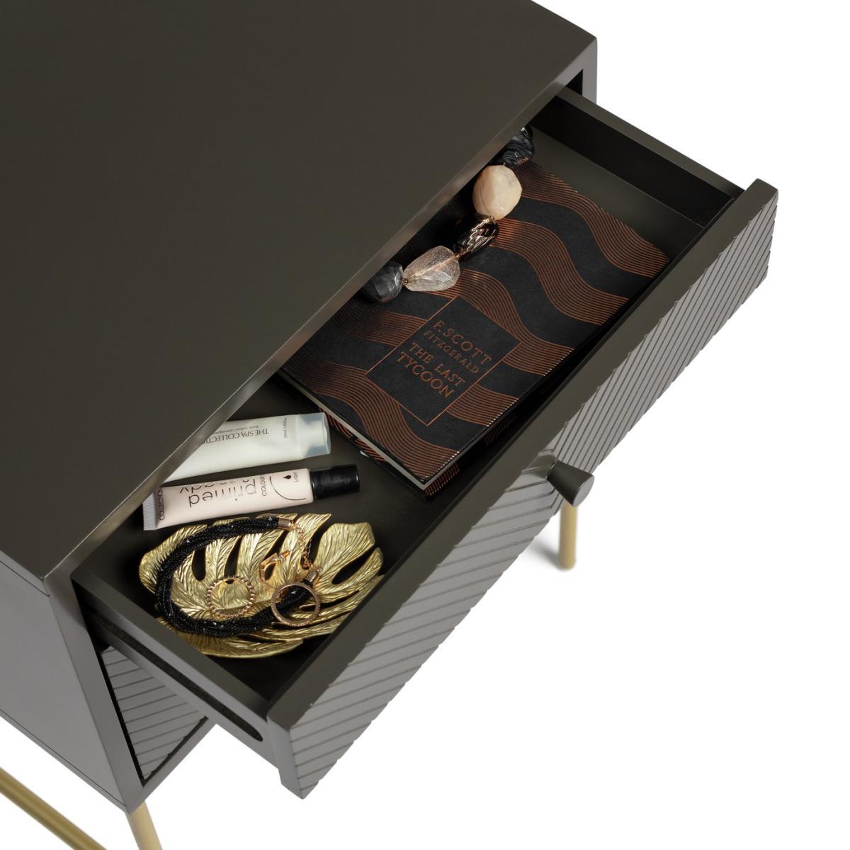 Hola Barcelona. This handsome charcoal nightstand with slender gold frame is refined and classy. Look closely to see the attractive carved drawer-front design feature that catches the eye. With two drawers, one slim and one deep, there is ample space for all your bedtime possessions. Books, phone chargers and jewellery can be tucked out of sight leaving your space clutter-free.