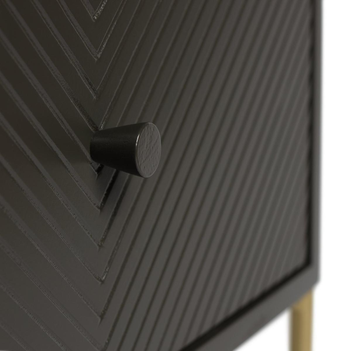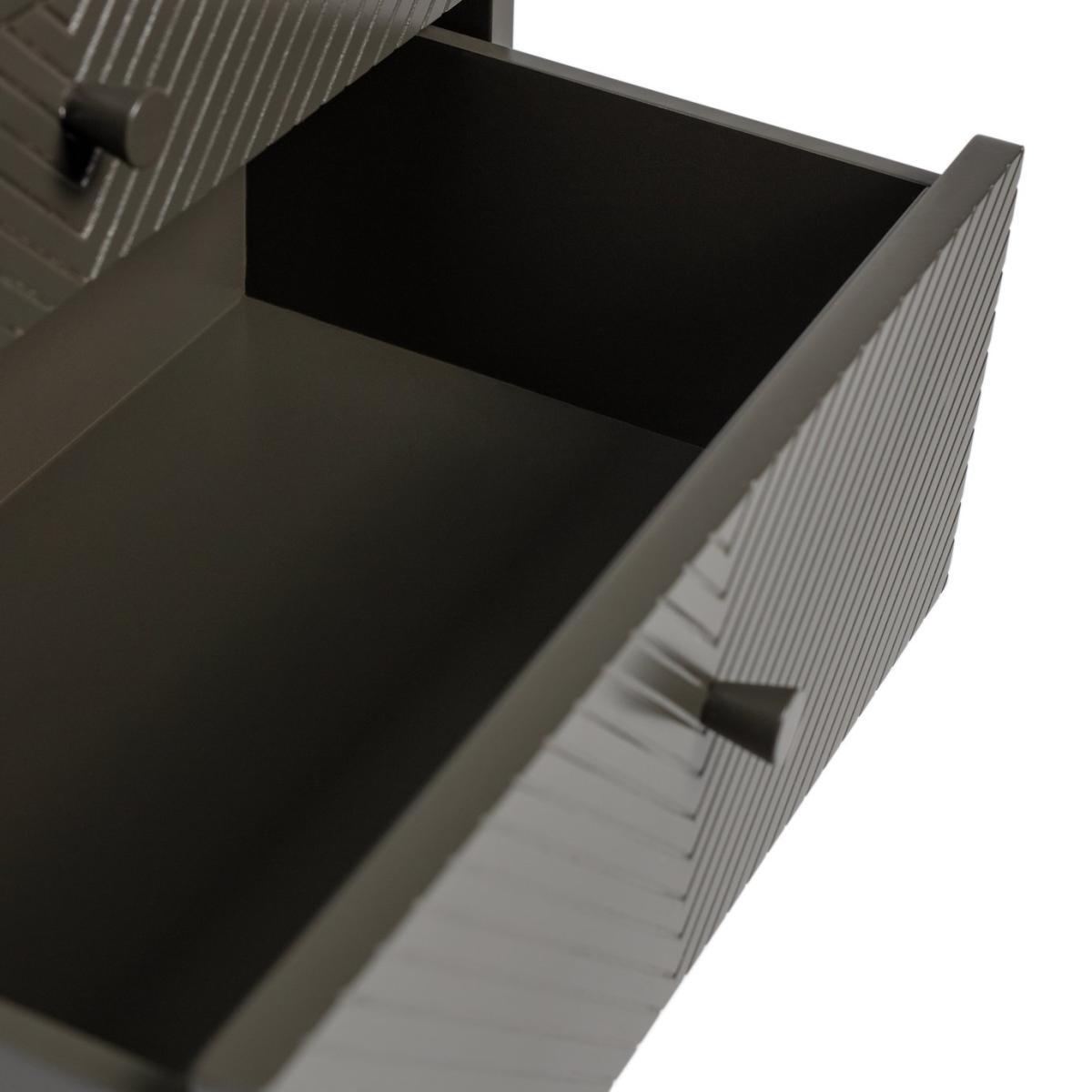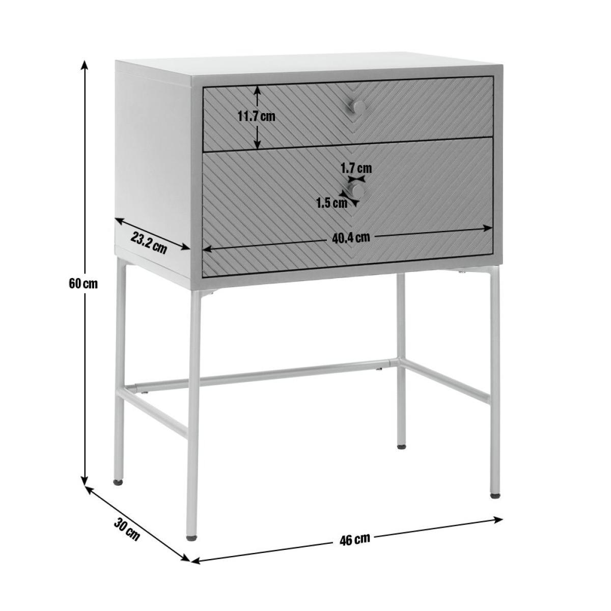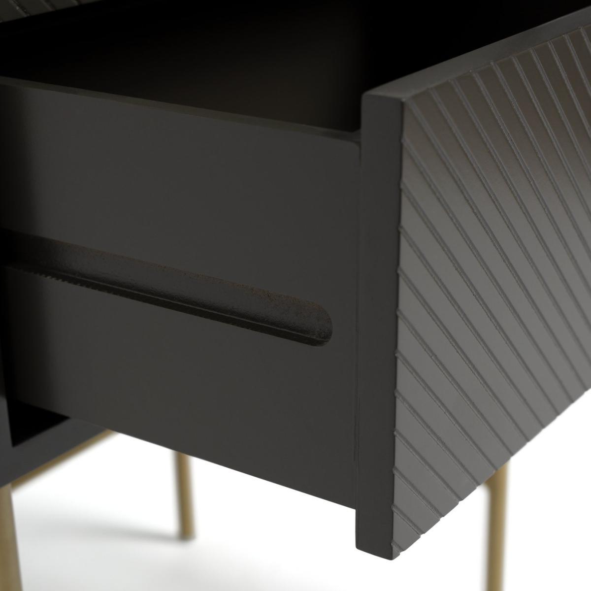 Hola Barcelona. This handsome charcoal nightstand with slender gold frame is refined and classy. Look closely to see the attractive carved drawer-front design feature that catches the eye. With two drawers, one slim and one deep, there is ample space for all your bedtime possessions. Books, phone chargers and jewellery can be tucked out of sight leaving your space clutter-free.