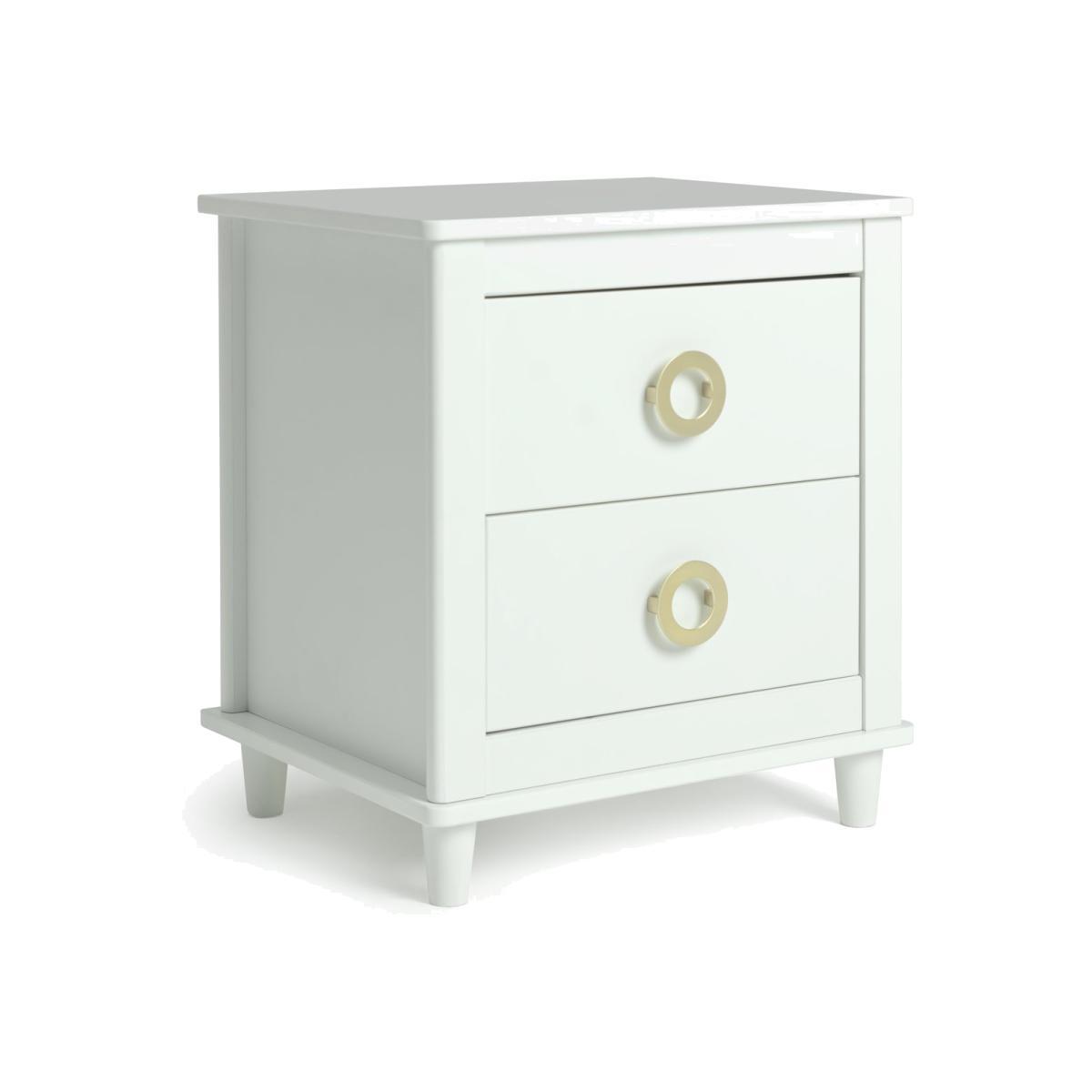 Modern and minimalistic. This Bardot bedside table is pure glamour. The combination of white wood with gold handles adds elegance in bundles. There's enough room for a lamp or a leafy plant on top. And the 2 drawers come with bags of room for chargers, books and magazines. Set on metal runners, the drawers are easy to open and close. Rounded edges soften the design and stylish conical feet keep this side table steady. Your bed's new best friend.
