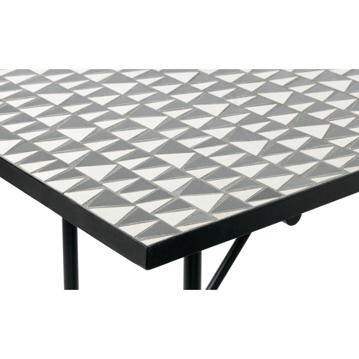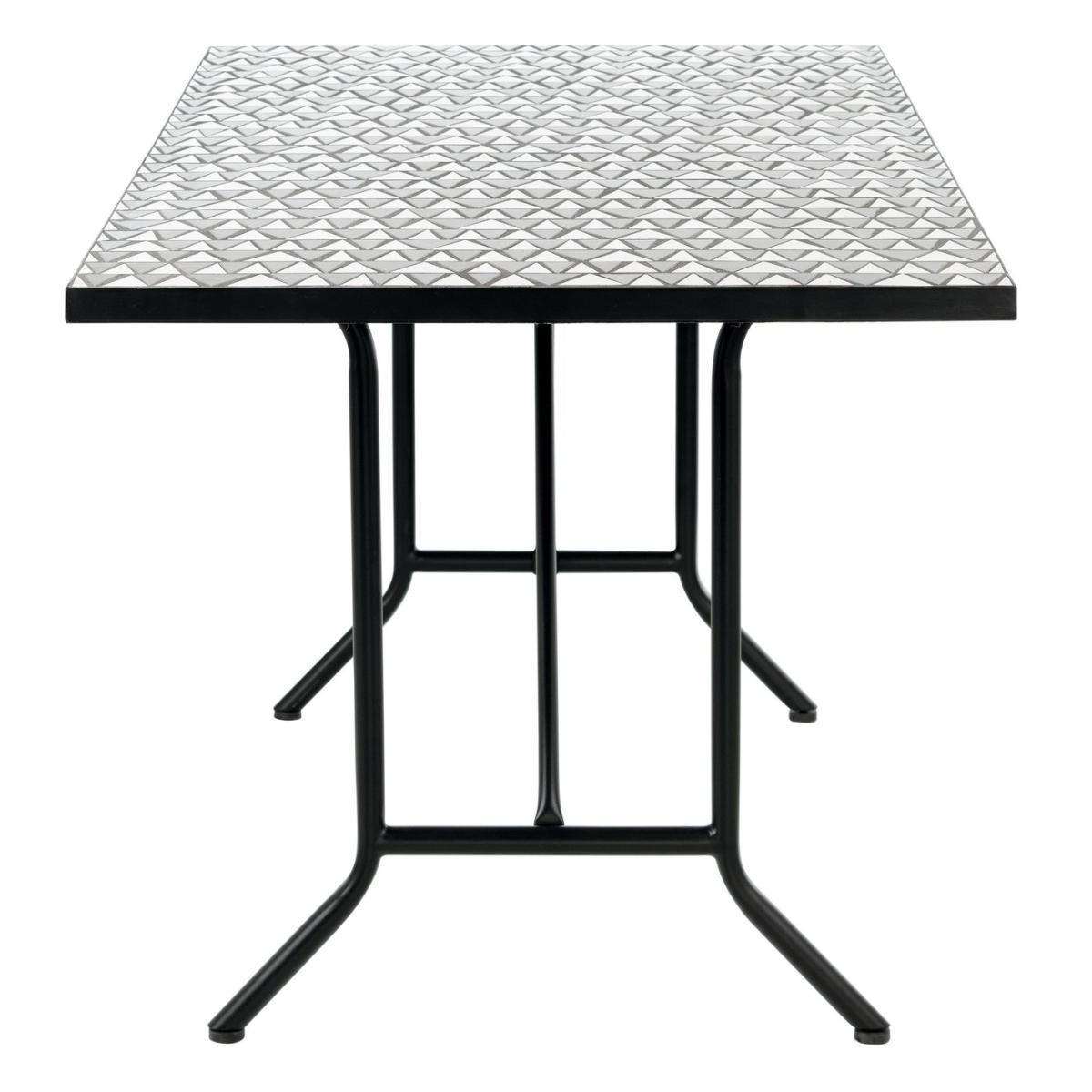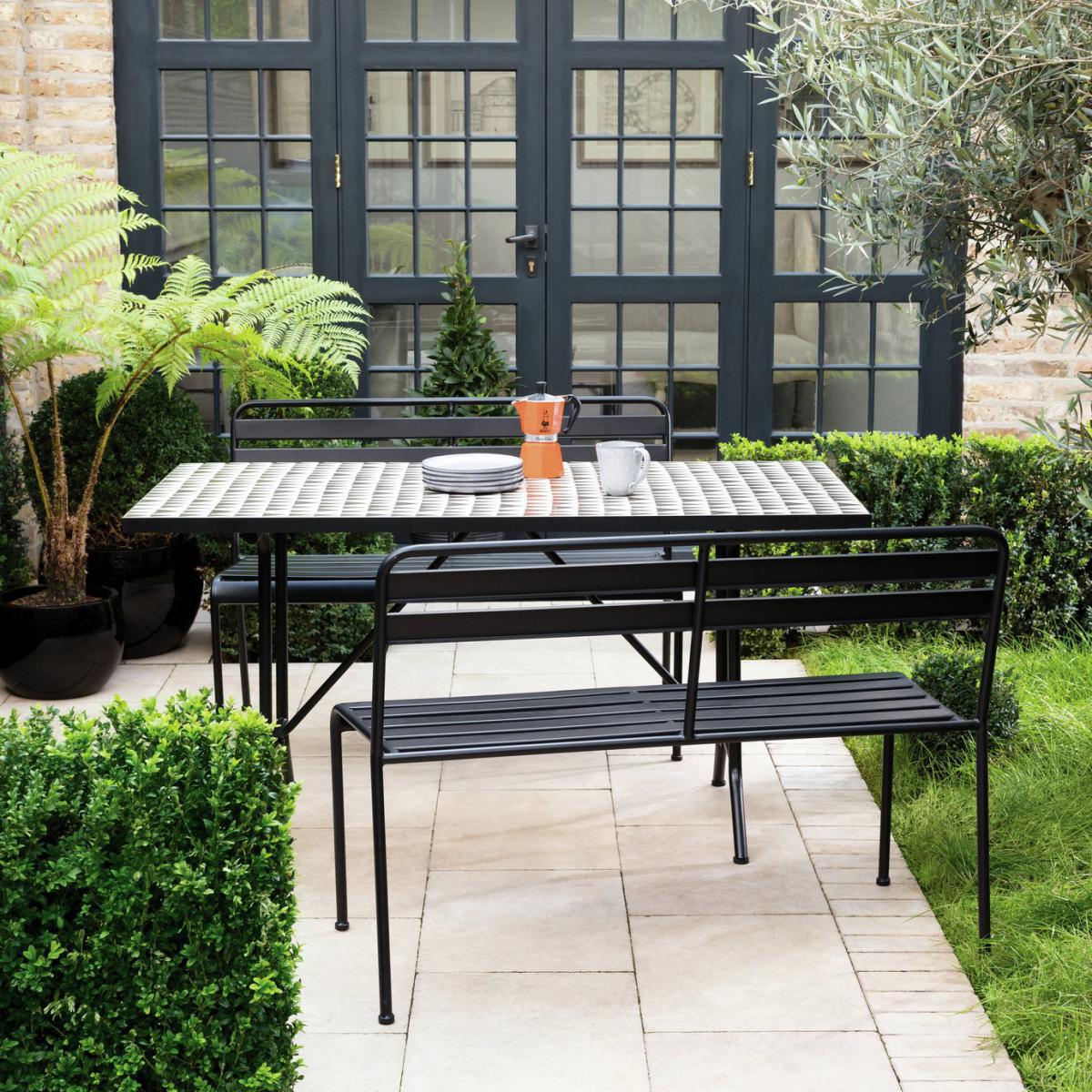 Organic, mosaic, ceramic. This modern monochrome outdoor dining set is very accommodating, With its handmade geo tiled top, the table has style covered from every angle. Contemporary with just a touch of art deco flare. And the pair of metal powder coated high-back benches complement the black table frame perfectly. There's plenty of space, 6 can kick back comfortably. What better excuse for being out on the tiles.