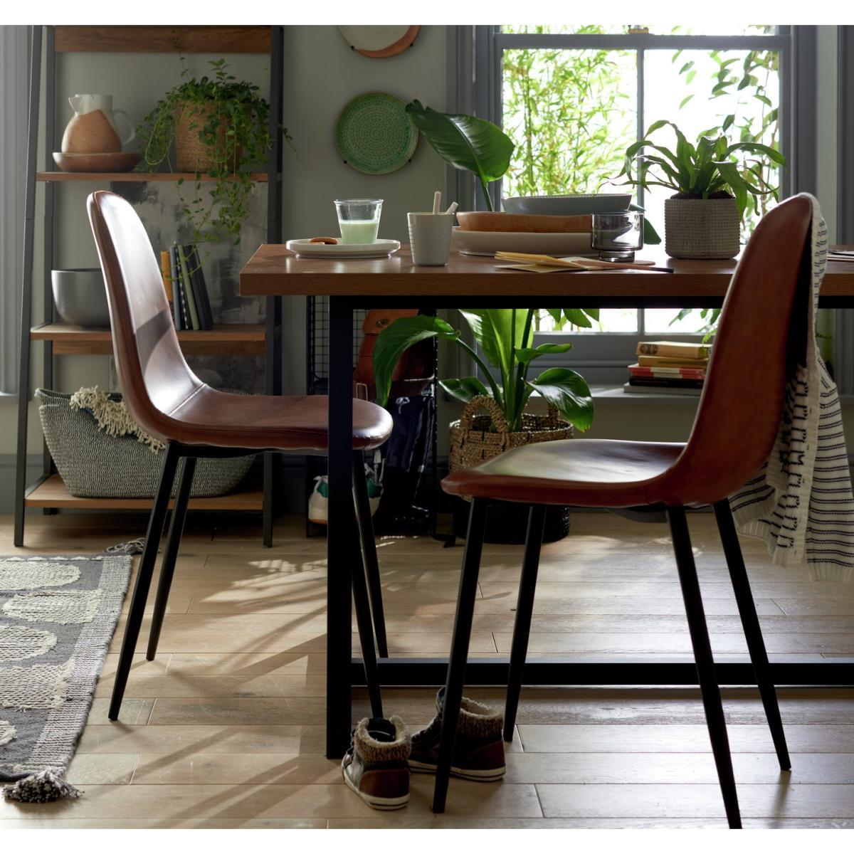 A shining testament to industrial design. The retro Habitat Beni chairs come with comfy padded seats and are upholstered in a smooth faux leather tan fabric. The distinctive tapered legs are finished in wood-effect for a laid-back natural finish. One for the style conscious.