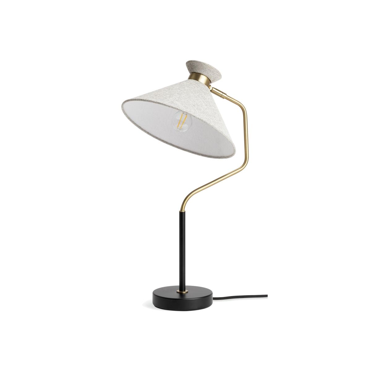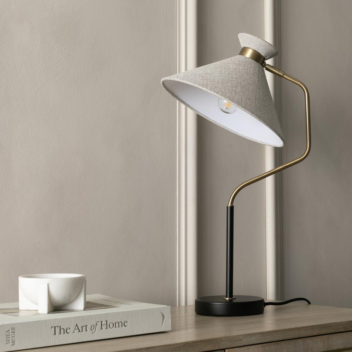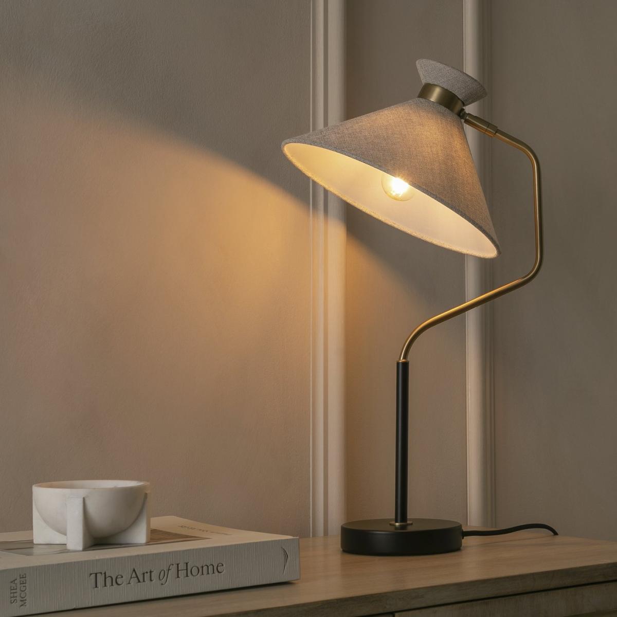 What a cool way to light up your space. With a striking silhouette, this lamp adds a touch of eye-catching style to any side table or desk. Features a grey cotton and linen conical shade. And a metal base in a matt black and brushed brass finish. Also, has an inline switch for easy on and easy off control. Check out our collection of bulbs to find the perfect match for this gorgeous lamp. Dimensions: Overall size H52, Diameter 28cm. Shade size H11, D26cm. Diameter of base 13cm. Cord length 1.8m. Bulb Information: Bulbs required 1 x candle E14 small edison screw LED bulb(s) (not included). Recommended maximum wattage: 6 watts. LED bulb only. General Information: Shade colour: grey. Base colour: black. Shade material: cotton and linen. Base material: metal. In-line switch. IP rating 20 - not suitable for bathroom use. Minimal assembly. This lighting product is a class 2 fitting. Bent Collection. Manufacturer's 1 year guarantee.