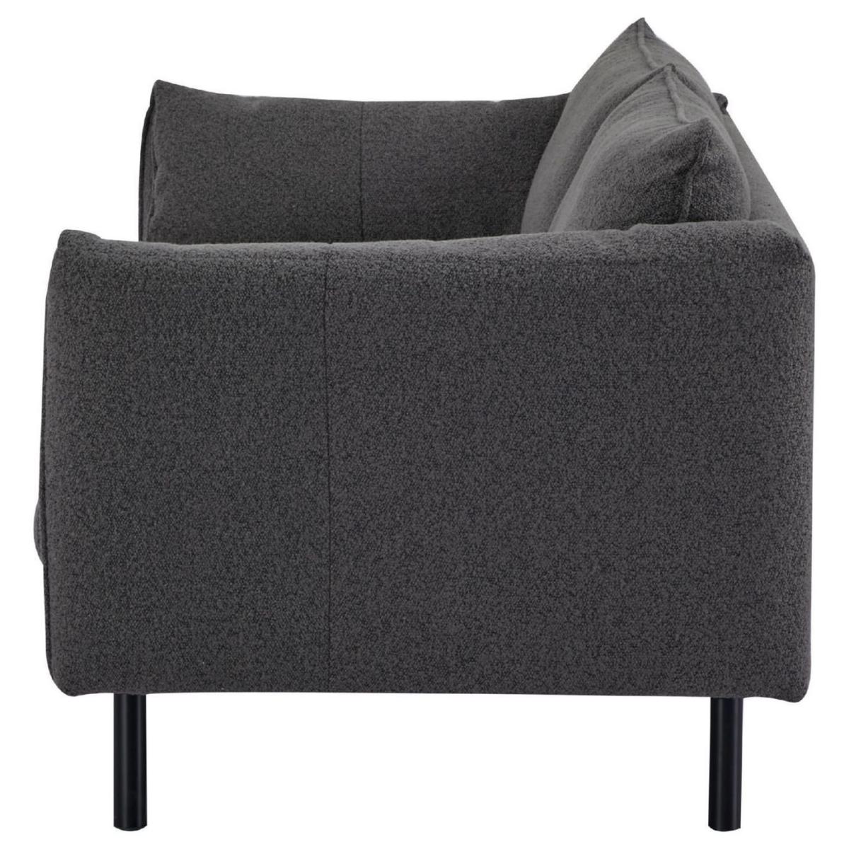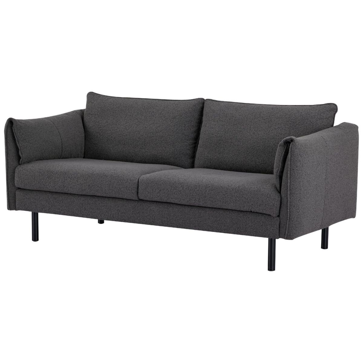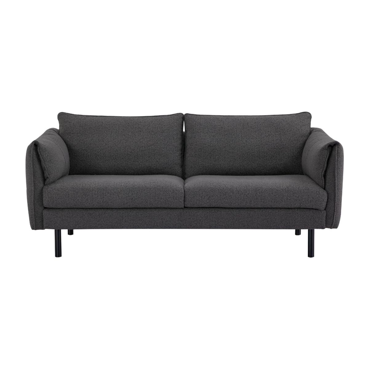 Betsy's a brilliant 2-seater designer sofa. Upholstered in a textured grey toned boucle, the low boxy design and metal legs add a sprinkling of contemporary style. Seats and cushions are padded with foam-fibre wrap for extra comfort. Betsy arrives packed in a box so it's easy to move, easy to assemble and easy on the eye. Part of the Betsy collection. Material: Made from 100% polyester. Metal feet - black. Medium firm seat cushions. Fixed seats with foam fibre wrap filling. Removable cushion(s) with fibre filling. Free fabric swatch available on this line. Dimensions: Size H80, W183, D83cm. Floor to seat height: 46cm. Depth of seat: 55cm. Height of seat back: 30cm. Width of seating area between arms: 164cm. Height of arm rest: 68cm. Weight: 42.3kg. Packaged dimensions: Package size H40, W163, D85cm. General information: FSC certified meaning the materials used for this product are responsibly sourced. Professional clean only. Plump cushions regularly to maintain shape. Fully assembled. Maximum individual user weight: 110kg. Manufacturer's 2 year guarantee.