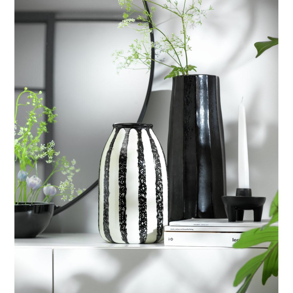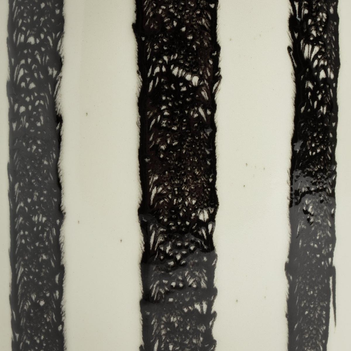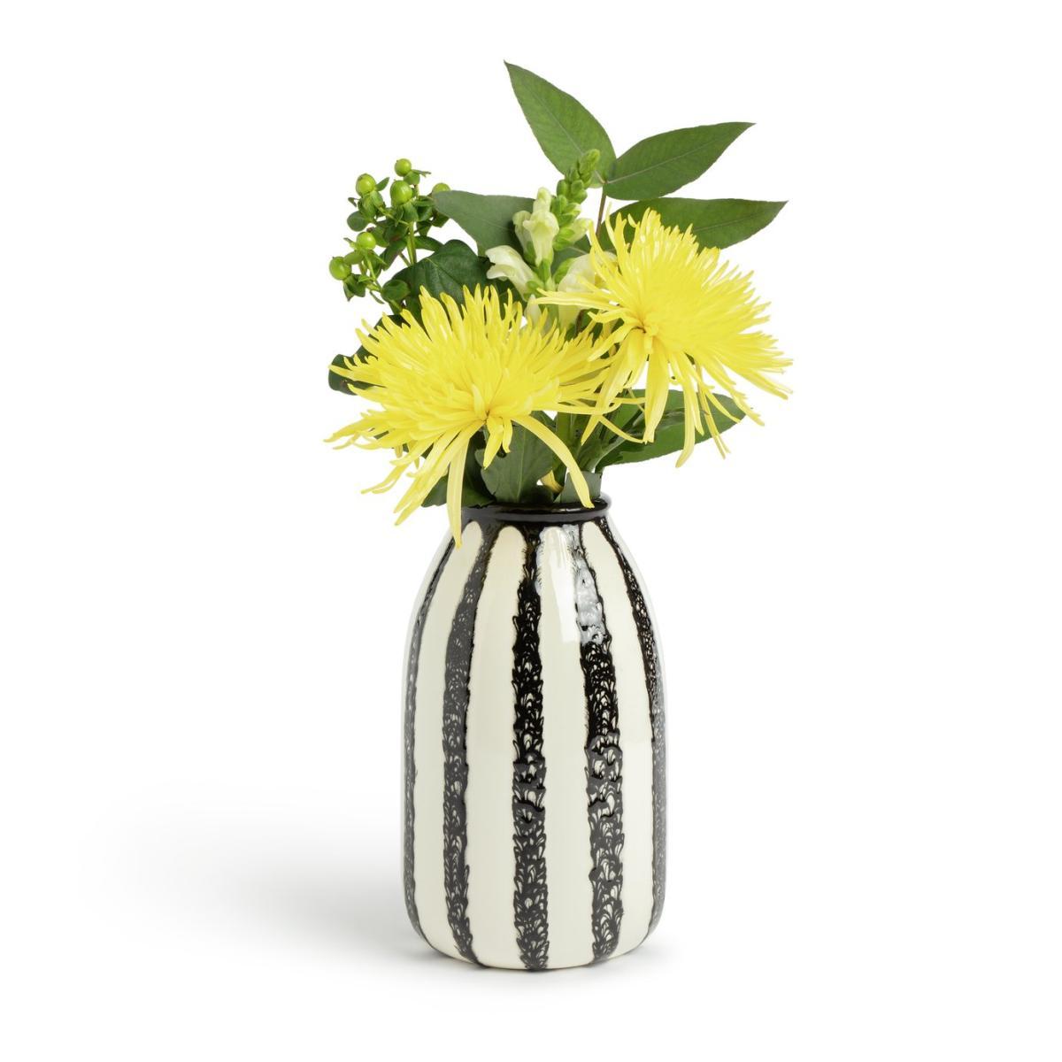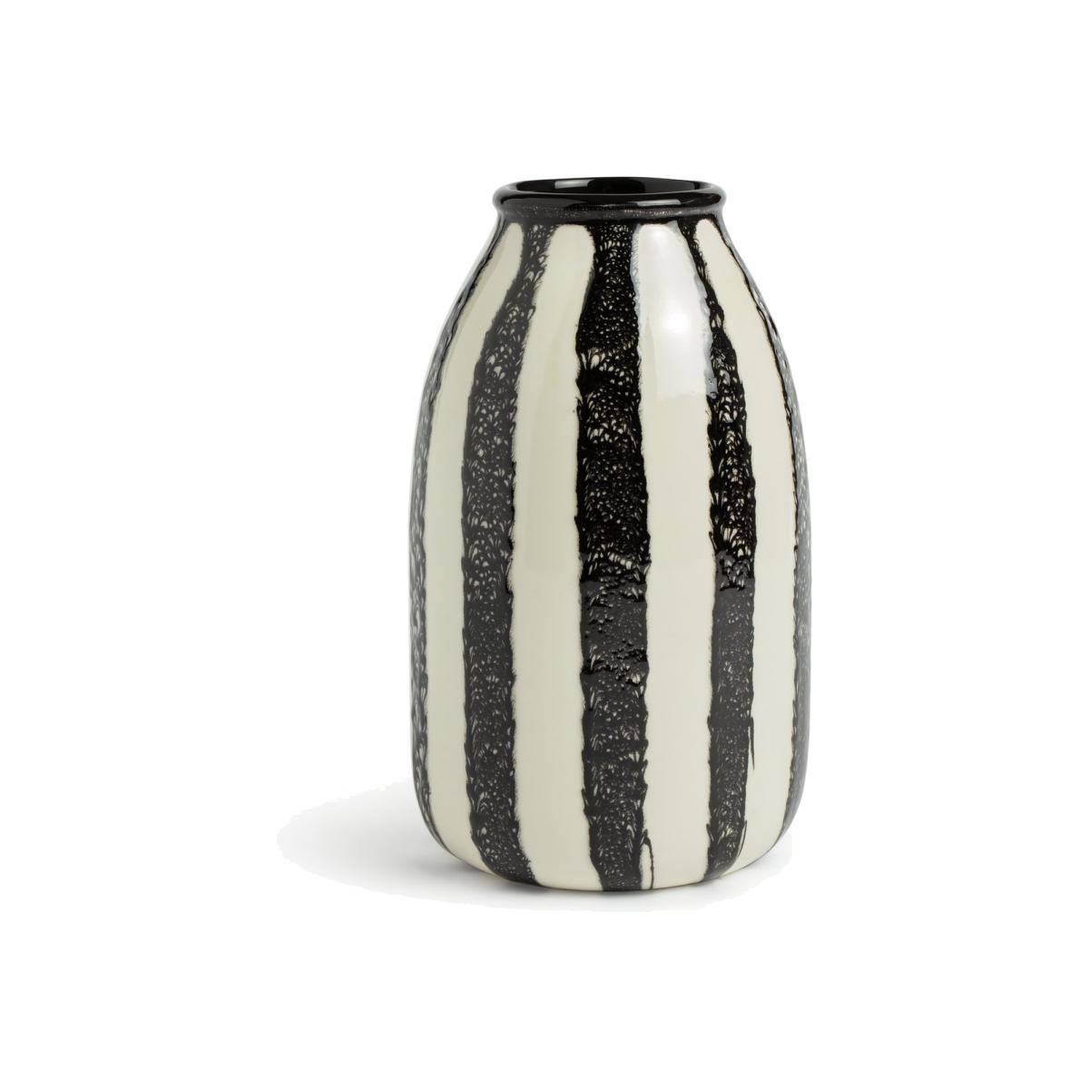 Sophisticated stripes. This elegant monochrome ceramic vase has been skilfully crafted and glazed. It could be mistaken for a work of art. The gently curved bottle shape combining mottled black and cream stripes is textured and tactile. Looks fab in a modern or contemporary setting. It's magnificent enough to take centre stage as an ornament. Or fill it with a colourful bouquet of flowers and pop on the kitchen table. Stunning. Size H24, W14.5, D14.5cm. Diameter 14.5cm.