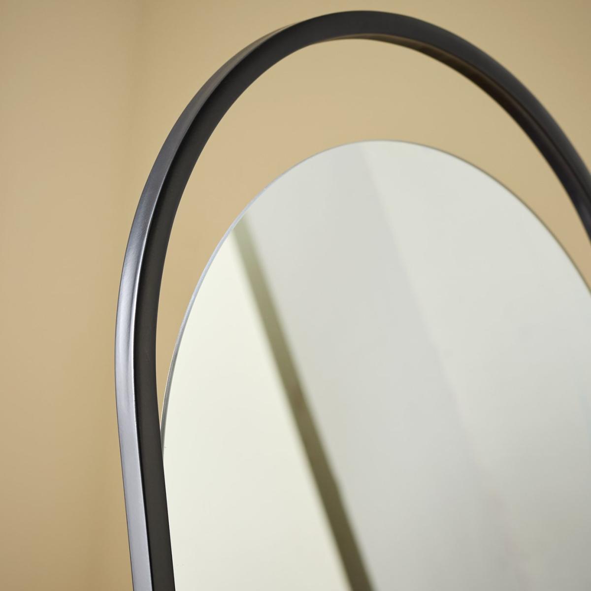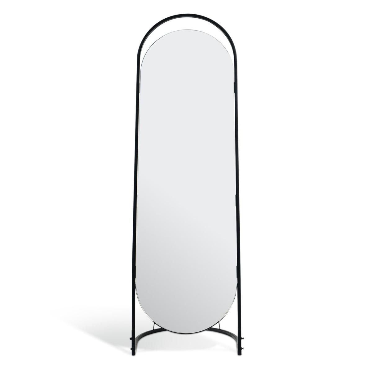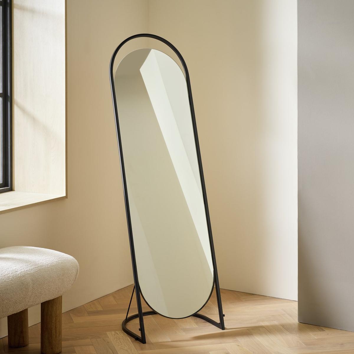 We love this full-length mirror with its quirky frameless top. The aesthetically pleasing gap gives it a fresh, contemporary feel. Encased in slim black metal, the curves emphasise its modern design. Freestanding it will enhance a room in a moment. Size H144, W45, D40cm. Frame material: Metal. Hanging fixture type:Freestanding. Freestanding mirror. Supporting foot. Total weight: 8.5kg. Fixtures and fittings included. Self-assembly.