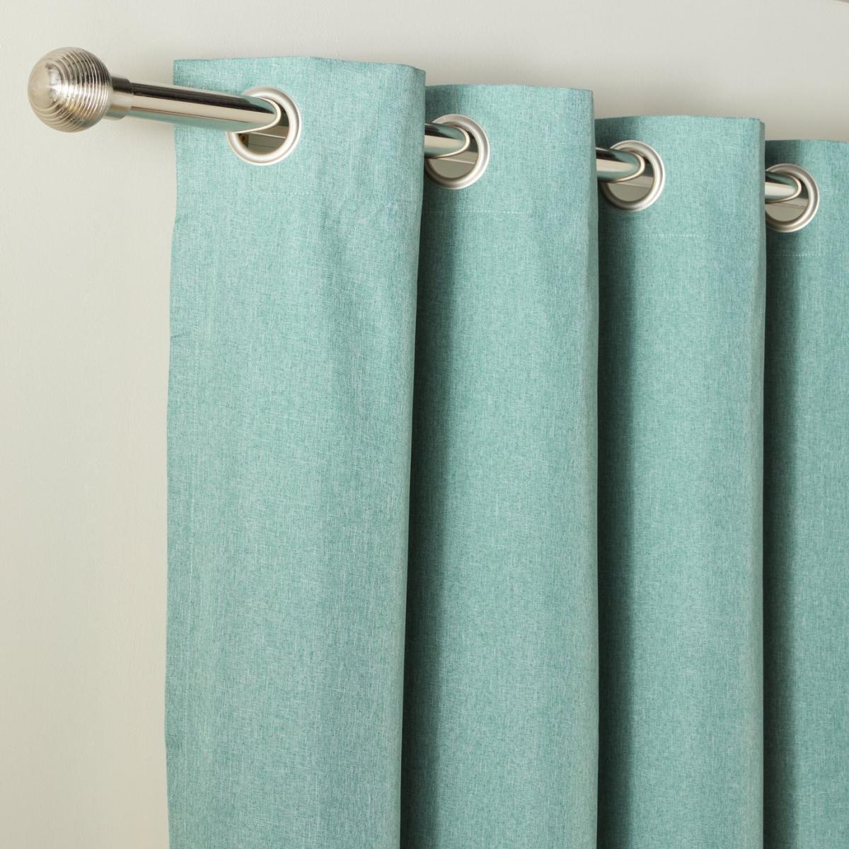 The curtains you're looking for are in the shade you want. Complement your decor with our pair of blackout-lined eyelet curtains. Softly elegant, they're an ideal way to give a room a quick and easy refresh. Simple to fit, just thread on a pole and hey presto, instant style upgrade. Features Teal plain design. Silver iron eyelets. Made from 100% polyester. Blackout. Dimensions Size 168cm (66 inches) wide by 183cm (72 inches) drop. Width refers to one curtain panel before hanging. Contains one pair of curtains (2 curtain panels). Dimensions provided include header tape. Eyelet diameter: 6cm. General information Curtain hooks/ rings included. Number of eyelets per curtain: 16. Suitable for curtain poles. Curtain pole not included. Does not include tie backs. Dry clean only. Not suitable for tumble drying.