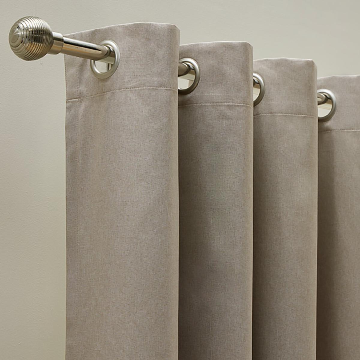 The curtains you're looking for are in the shade you want. Complement your decor with our pair of blackout-lined eyelet curtains. Softly elegant, they're an ideal way to give a room a quick and easy refresh. Simple to fit, just thread on a pole and hey presto, instant style upgrade. Features Stone plain design. Silver iron eyelets. Made from 100% polyester. Blackout. Dimensions Size 117cm (46 inches) wide by 183cm (72 inches) drop. Width refers to one curtain panel before hanging. Contains one pair of curtains (2 curtain panels). Dimensions provided include header tape. Eyelet diameter: 6cm. General information Curtain hooks/ rings included. Number of eyelets per curtain: 12. Suitable for curtain poles. Curtain pole not included. Does not include tie backs. Dry clean only. Not suitable for tumble drying.
