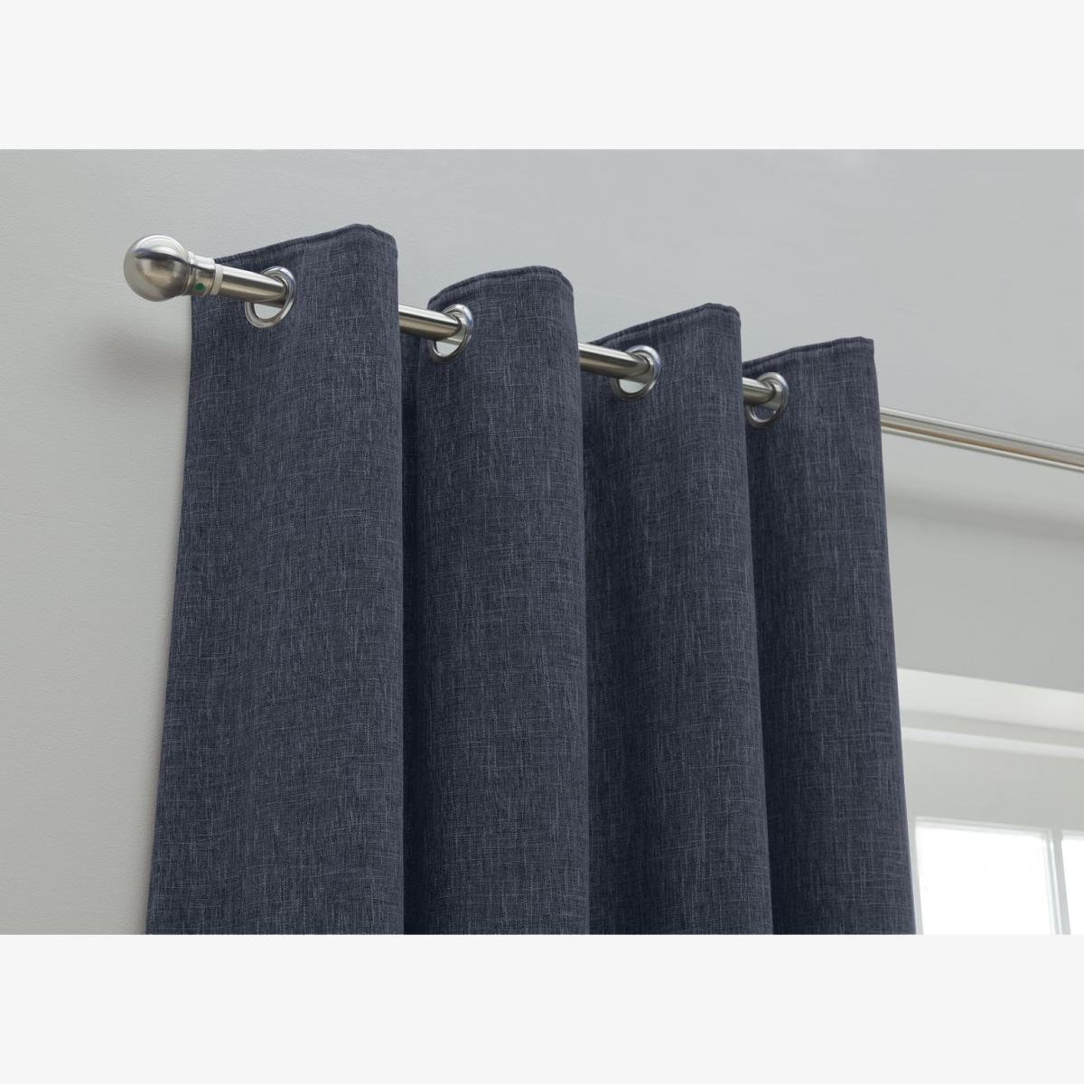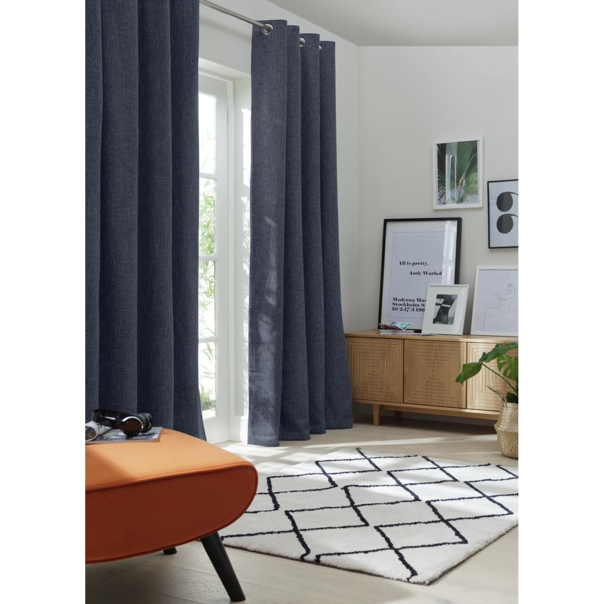 How many 'likes' do we get for linen look curtains? Lots. Especially when they come in navy. It's a colour you can vamp up with bold backgrounds or dial down with neutrals to keep things calm. A shade versatile, don't you think? Bring out the natural beauty of these textured fabric curtains by choosing cushions and rugs that pick up on the relaxing decor. Navy Plain Design. Silver stainless Eyelets. Features Blackout thermal. Made from 70% polyester and 30% viscose. Lined. Lining made from 100% polyester. Dimensions Size 168cm (66 inches) wide by 229cm (90 inches) drop. Dimensions provided include header tape. Width refers to one curtain panel before hanging. Depth of header tape: 4 inch/ 4cm. General information Contains one pair of curtains. Suitable for curtain poles. Curtain pole not included. Dry clean only. General Information: We are excited to be welcoming some of our favourite HOME products into the Habitat range. Your product may arrive in Habitat or HOME packaging.