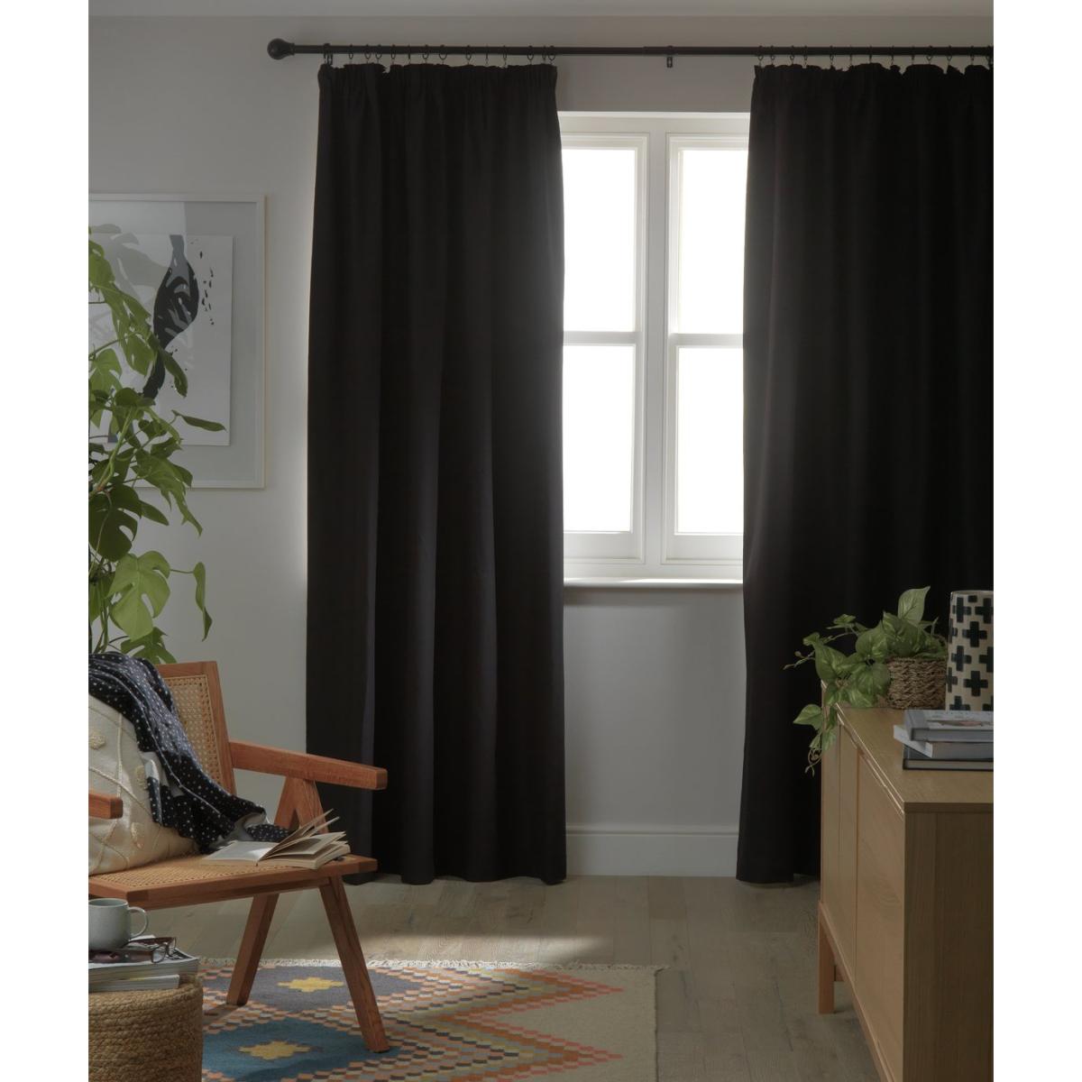 Sleep tight. These midnight black curtains offer instant darkness and maximum privacy. Our luxuriously soft, thick polycotton material keeps light out and heat in. So, light sleepers can nap soundly day or night while saving on the energy bills. Soft to touch too, this classic and simple pencil pleat design is ideal for your bedroom or lounge. Sweet dreams. Black. Features Blackout. Made from 52% polyester and 48% cotton. Unlined. Dimensions Size 117cm (46 inches) wide by 137cm (54 inches) drop. Dimensions provided include header tape. Width refers to one curtain panel before hanging. General information Contains one pair of curtains. Suitable for curtain tracks. Curtain pole not included. Machine washable. General Information: We are excited to be welcoming some of our favourite HOME products into the Habitat range. Your product may arrive in Habitat or HOME packaging.
