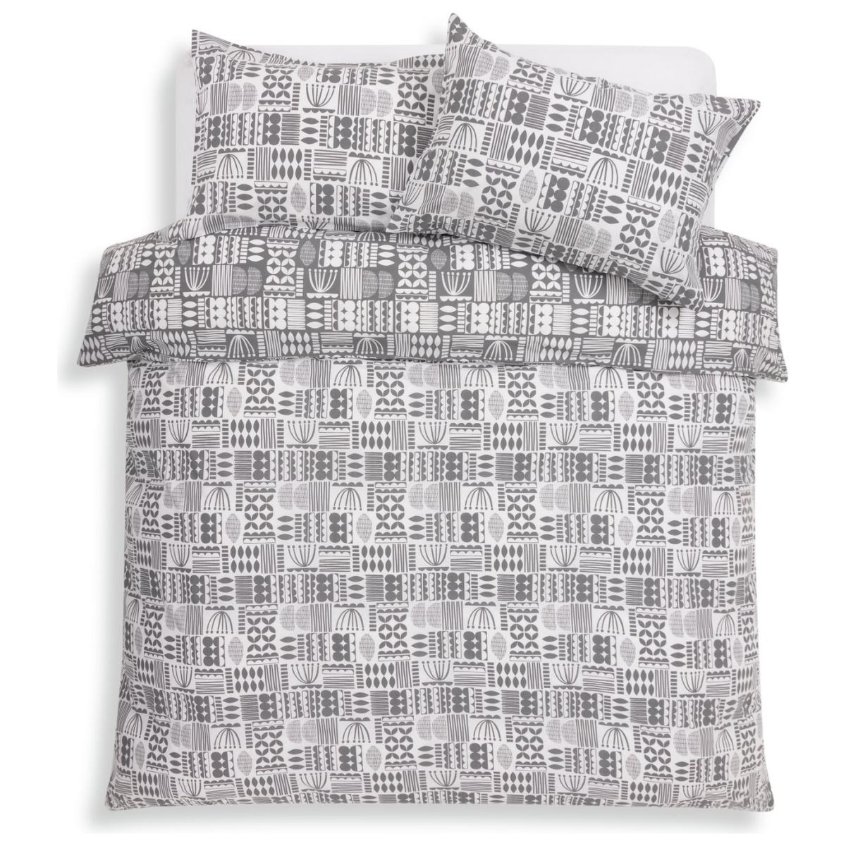 Nothing says personality more than a good Scandi print. And this tonal monochromatic artsy bedding set fits the bill. An intricate, upbeat geometric block print keeps things interesting. While the soft and comfy finish makes it a dream to sleep in. We love it. This item carries the STANDARD 100 by OEKO-TEX logo, which means you can be certain that every component has been tested for harmful substances and is therefore harmless to human health. Finish: woven. 50% cotton , 50% recycled polyester. 144 thread count. Set includes 1 duvet cover and 2 pillowcases. Bed size: super king. Length 220cm, Width 230cm. Reversible. Standard pillowcase (s). Pillow case length 75cm, Width 50cm. Reversible pillowcase (s). Machine washable at low temperature. Suitable for tumble drying.
