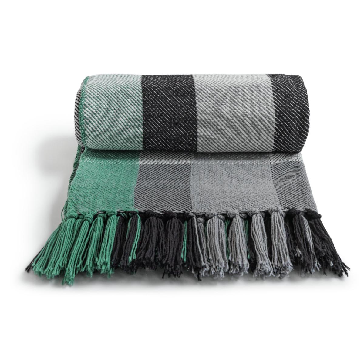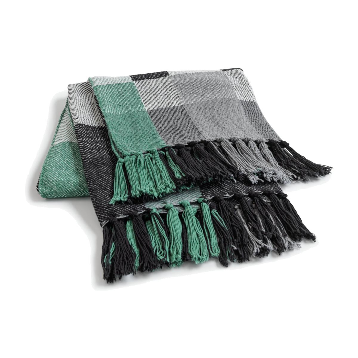 Check this out. Drape our handsome block woven throw over your sofa or bed to add a dash of contemporary style to your space. The colour combination of grey, black, and green are calming and soothing and go beautifully in a neutral or minimal decor. Gloriously tactile tassels add a dash of classic charm. Crafted in 100% cotton, this cosy cover is ideal for throwing over your shoulders or wrapping up on chilly evenings. Cool, fresh and cuddly. Get the loft-living look. Pair with contemporary finishing touches in our Industrial collection.