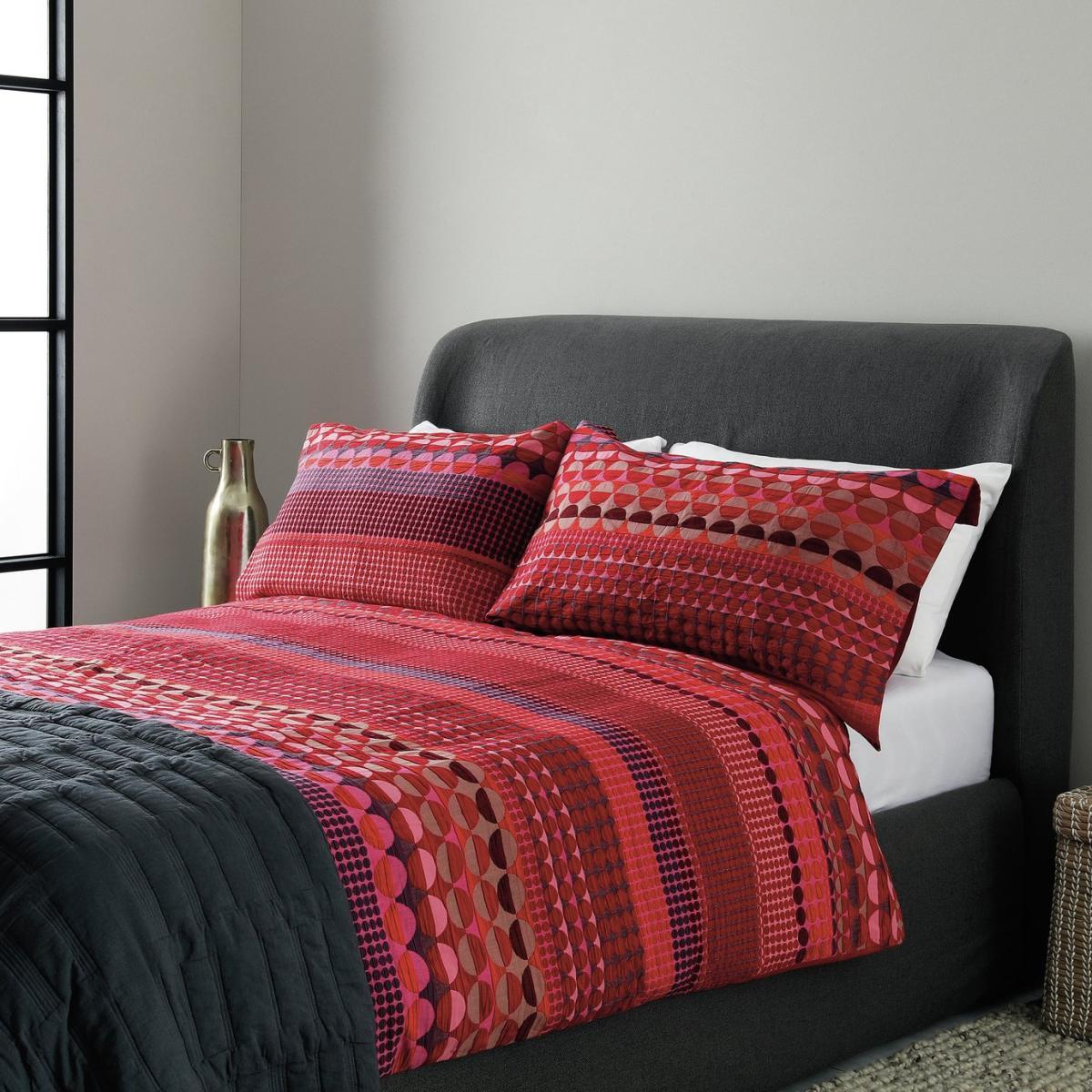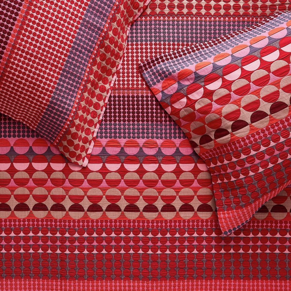 The luxurious Bloomsbury red jacquard double duvet cover set has an intricate pattern of spots in saturated tonal shades and a soft, textured feel. Bloomsbury was designed exclusively for Habitat by Margo Selby and the bed linen is woven in Portugal using a double-layered jacquard technique. The Bloomsbury range includes duvet sets and pillowcases, available in a choice of sizes and colours, with a 200 thread count cotton percale reverse for added comfort.