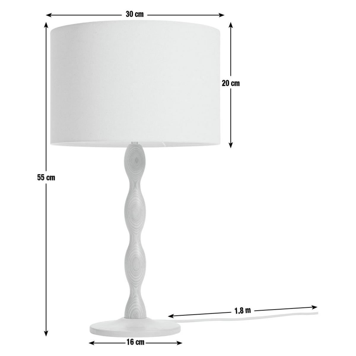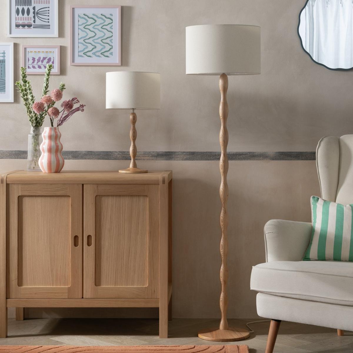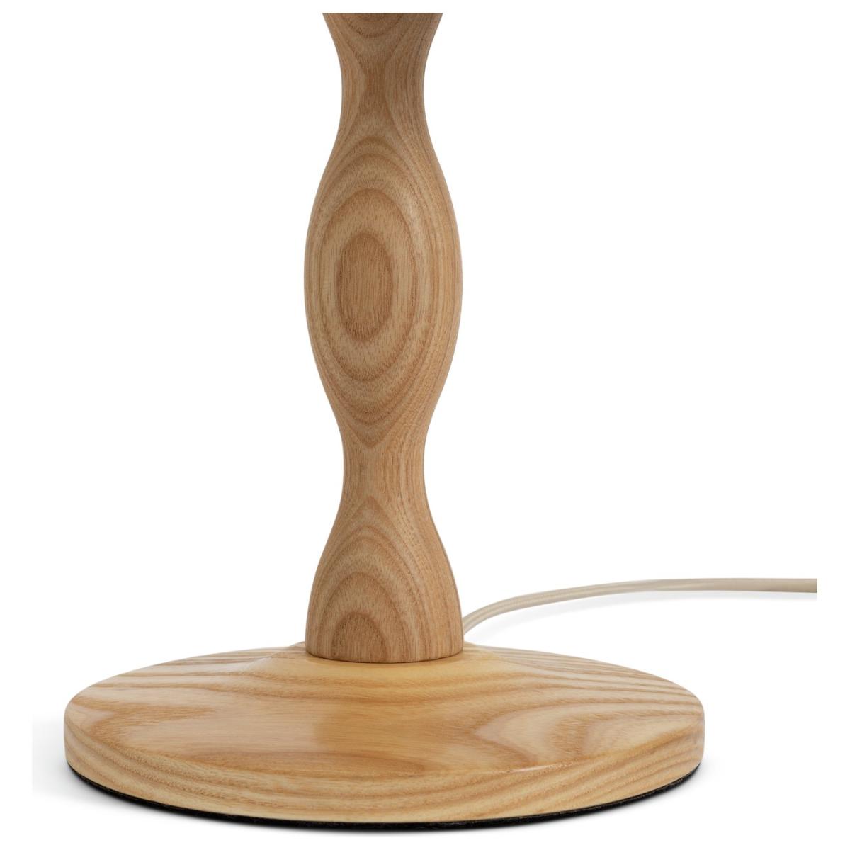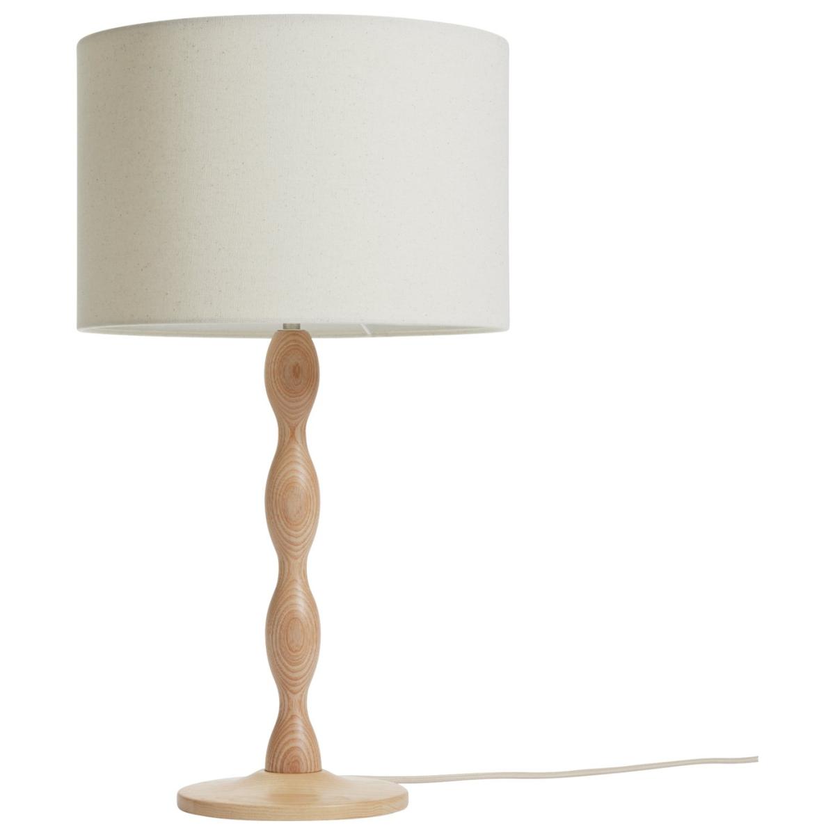 Cut a dash with ash. This table lamp is irresistibly touchable with its smooth undulating wooden base. Carved from Ash It displays the natural beauty of the grain. Topped with a cream linen shade it has an overall freshness that'll light up any space. Turning this lamp on or off is easy with the inline switch. Dimensions: Overall size H55, Diameter 30cm. Shade size H20, D30cm. Diameter of base 16cm. Cord length 1.8m. Bulb Information: Bulbs required 1 x classic E14 small edison screw LED bulb(s) (not included). Recommended maximum wattage: 10 watts. General Information: Shade colour: cream. Base colour: natural. Shade material: linen. Base material: wood. In-line switch. IP rating 20 - not suitable for bathroom use. Minimal assembly. Product is mains powered plug in. This lighting product is a class 2 fitting. Bobbin. Manufacturer's 1 year guarantee. FSC certified meaning the materials used for this product are responsibly sourced.