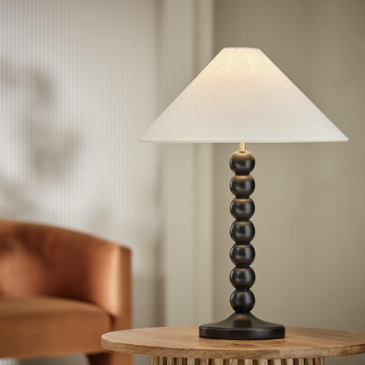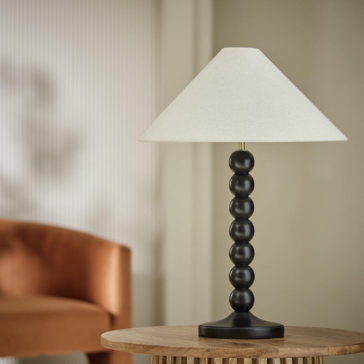 Creating your own lighting look? Start with our Bobbin table lamp base. Made from solid mango wood with a deep black finish, it has a circular base and distinctive spherical bobbin detailing on it's stem. Just add a shade of your choice. Features an inline switch for easy on, easy off. We recommend a 30 - 40cm shade with this base. Dimensions: Diameter of base 16cm. Cord length 2.5m. Bulb Information: E27 edison screw(not included). Recommended maximum wattage: 9 watts. LED bulb only. General Information: Base colour: black. Base material: wood. In-line switch. This lighting product is a class 2 fitting. Part of the Bobbin collection. Manufacturer's 1 year guarantee. FSC certified meaning the materials used for this product are responsibly sourced.